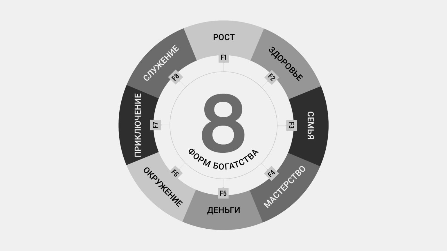 <…> Модель «Восемь форм богатства» основана на восьми тайных (потому что о них не принято говорить) привычках, которыми стоит овладеть каждому. Вот они.