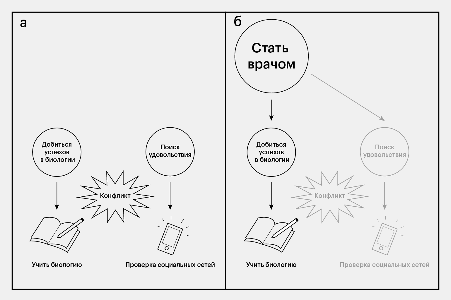 На этой иллюстрации из исследования Анжелы Дакворт мы видим, как конкретная цель «стать доктором» разрешает конфликт между мгновенным и долгосрочным вознаграждением. Чтобы добиться успехов в биологии, нужно понимать, зачем это нужно. Если у вас есть цель поступить в медицинский университет, то вы не будете отвлекаться на скроллинг ленты в соцсетях и будете штудировать учебники. Если цели дать клятву Гиппократа нет, то и добиваться успеха в биологии незачем.