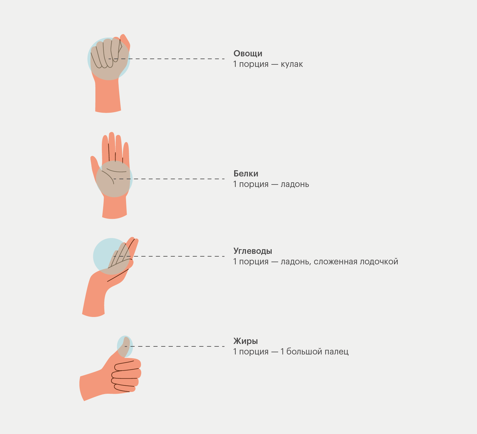 - Порция углеводов (например, крупы или макарон) — размером с руку, сложенную лодочкой.