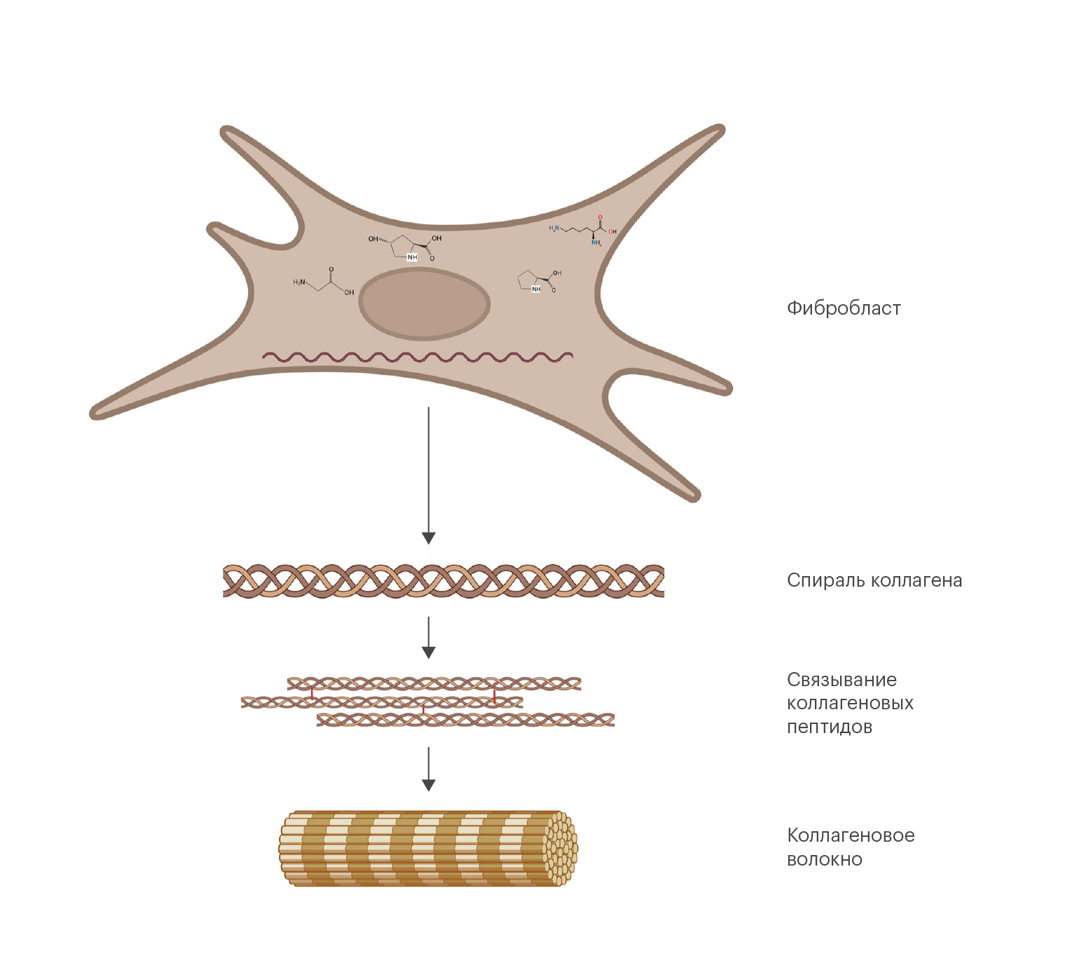 - 1-й этап — внутриклеточный. «Заготовку» коллагена формируют фибробласты — клетки с отростками, похожие на морскую звезду. В фибробластах аминокислоты глицин, пролин и лизин соединяются в длинную цепочку — получается проколлаген. В этом процессе активно участвует витамин С, который помогает ферментам изменять и упаковывать аминокислоты в цепочку [4].