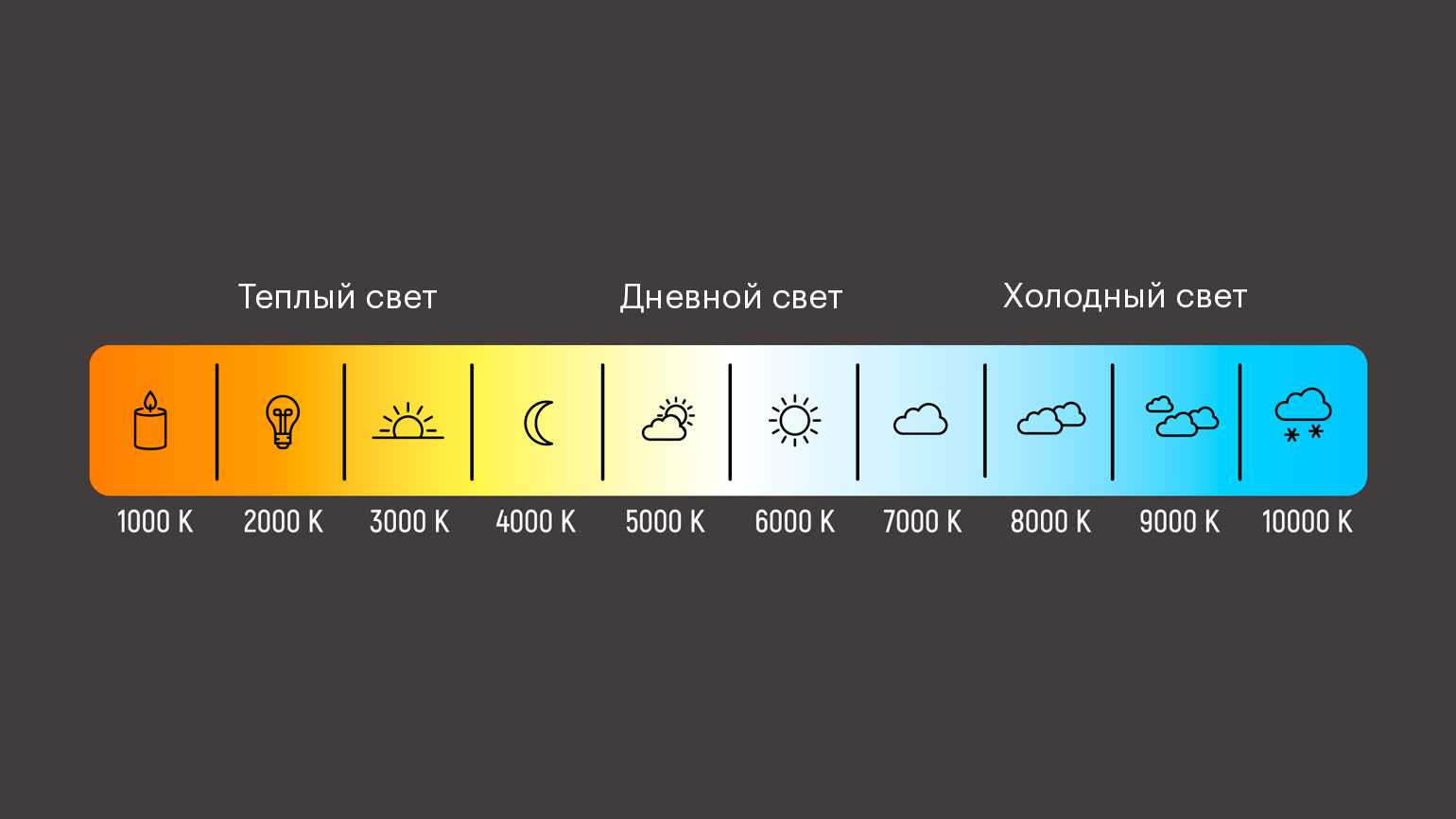 У естественного и искусственного света есть цветовая температура — это показатель белизны света. Он измеряется в градусах Кельвина (К) по шкале от 1000 (тёплый, жёлтый свет) до 10 000 (холодный, синий свет), посередине — белый свет [1].