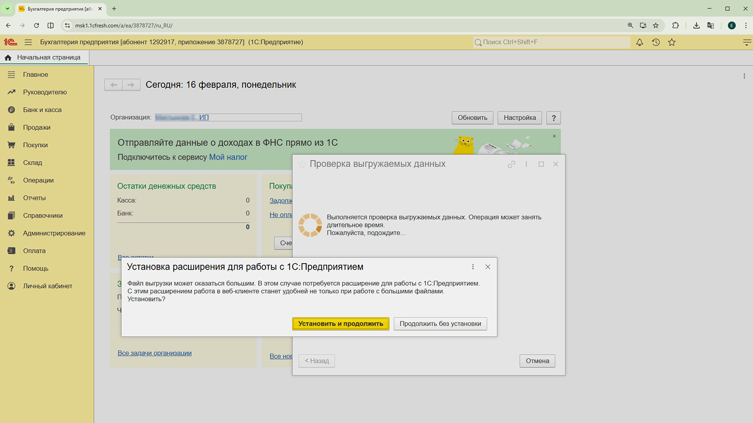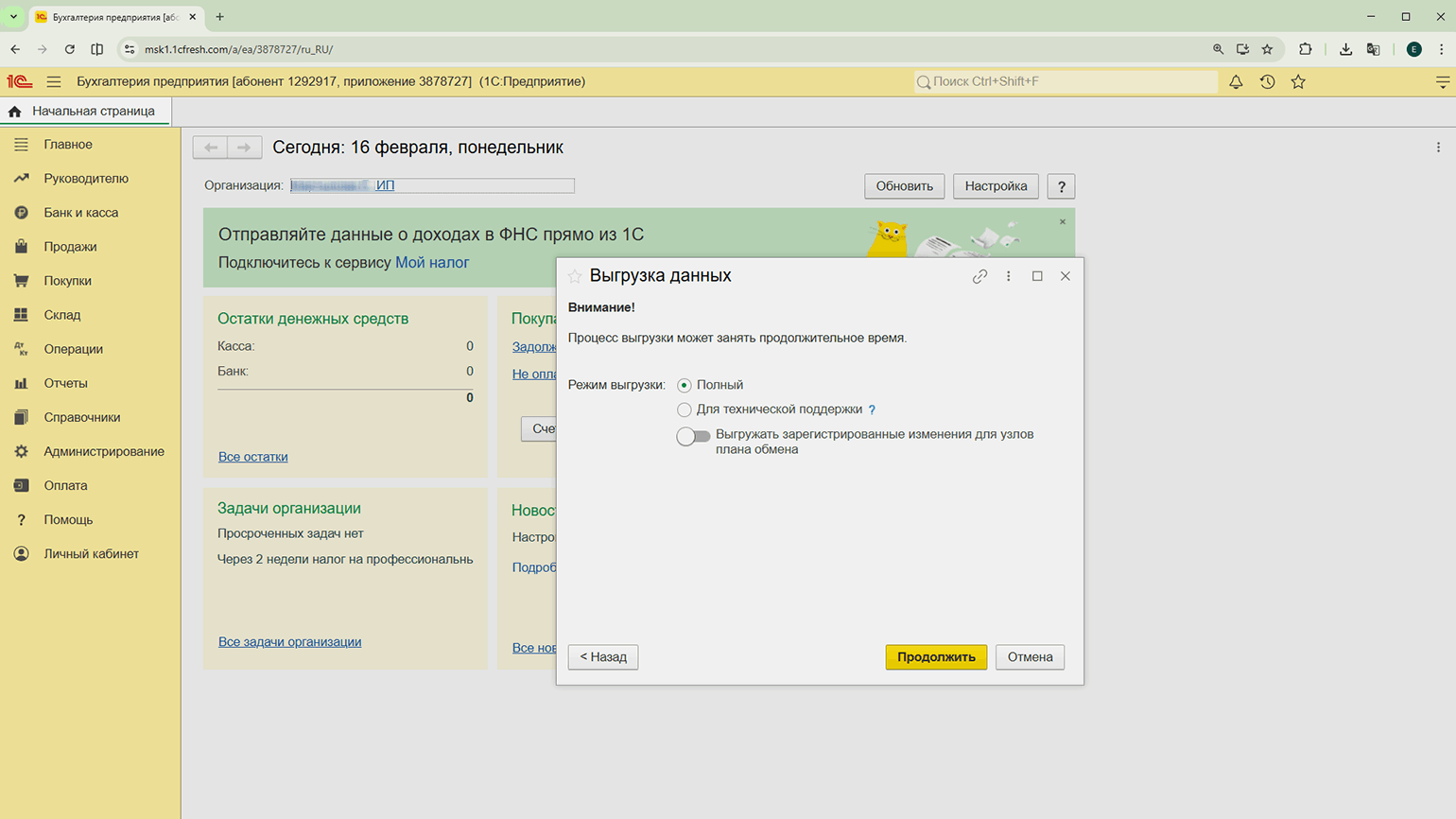После нажатия кнопки «Продолжить» начнётся процесс экспорта. В это время вход в копируемую базу будет заблокирован, но работа с другими базами сервиса останется доступной.