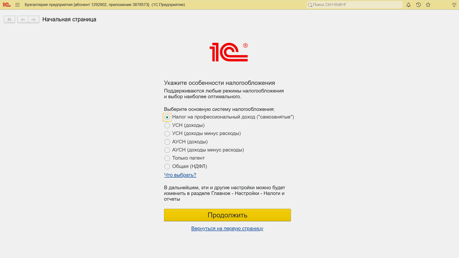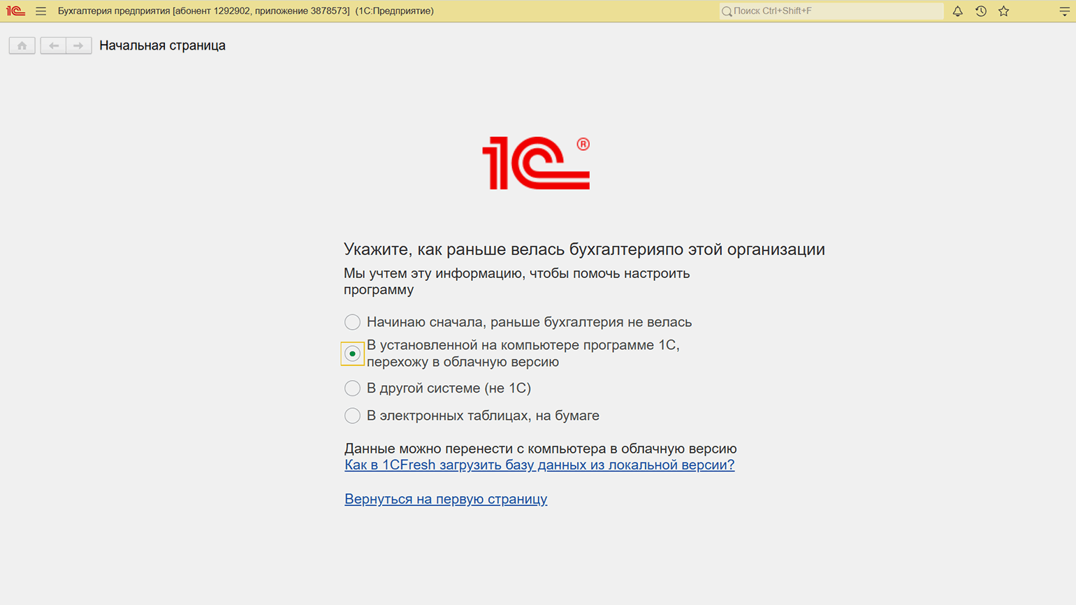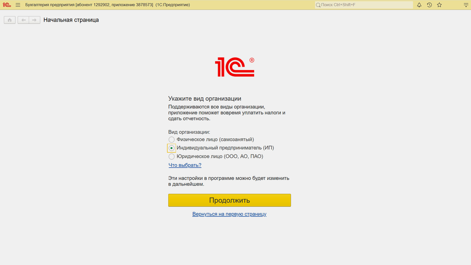 Начало работы в приложении. Рассмотрим работу сервиса на примере «1С:Бухгалтерия предприятия 8». После выбора приложения нужно пройти этапы первичной настройки: указать ИНН организации, выбрать организационную форму предприятия, вид деятельности и другие данные.