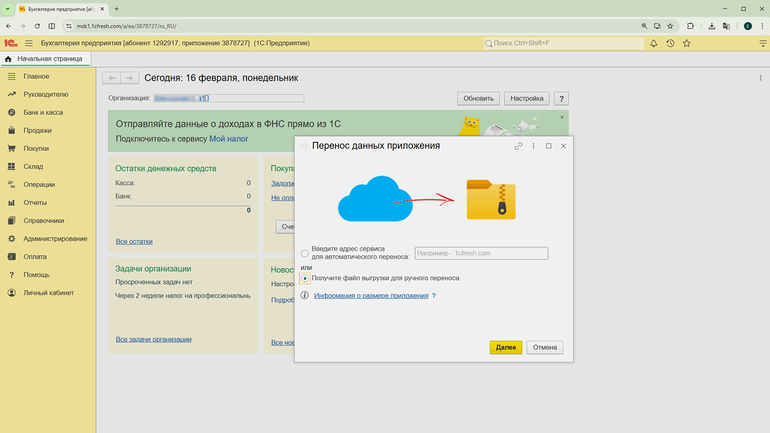 Выгрузка базы данных из «1С:Фреш». Копию базы данных можно сохранить в облаке или на компьютере — например, для архивного хранения или дальнейшей загрузки в локальную версию программы.