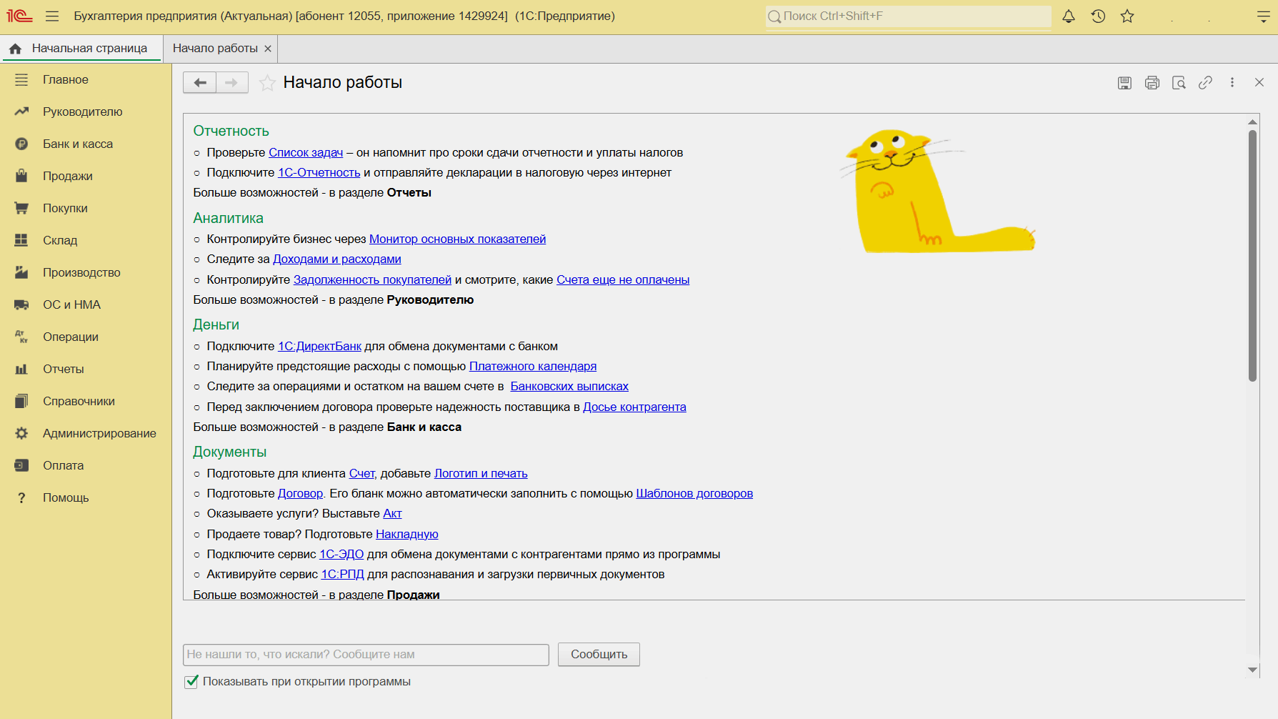 Загрузка данных. Пользователь может начать работу как с нуля, так и с импортом данных — можно внести остатки вручную, загрузить базу из других систем учёта или из локальной версии «1С». Всё это можно сделать в разделе «Главное», в блоке «Начало работы». Это может быть сложно — в случае затруднений стоит обратиться к техническим специалистам.