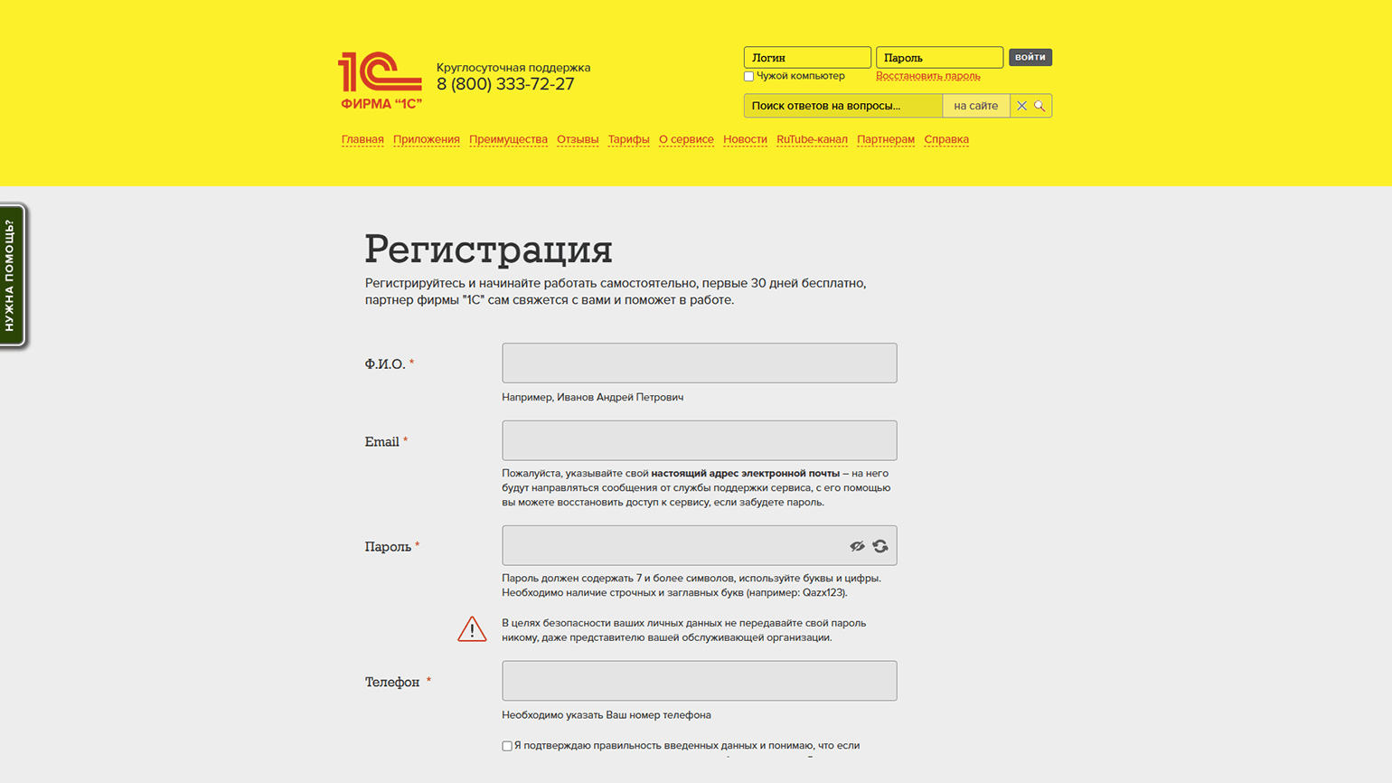 Регистрация. Для начала работы нужно перейти на сайт «1С:Фреш» и авторизоваться или создать новый аккаунт. Для регистрации потребуется ввести Ф. И. О., адрес электронной почты, номер телефона и придумать пароль.