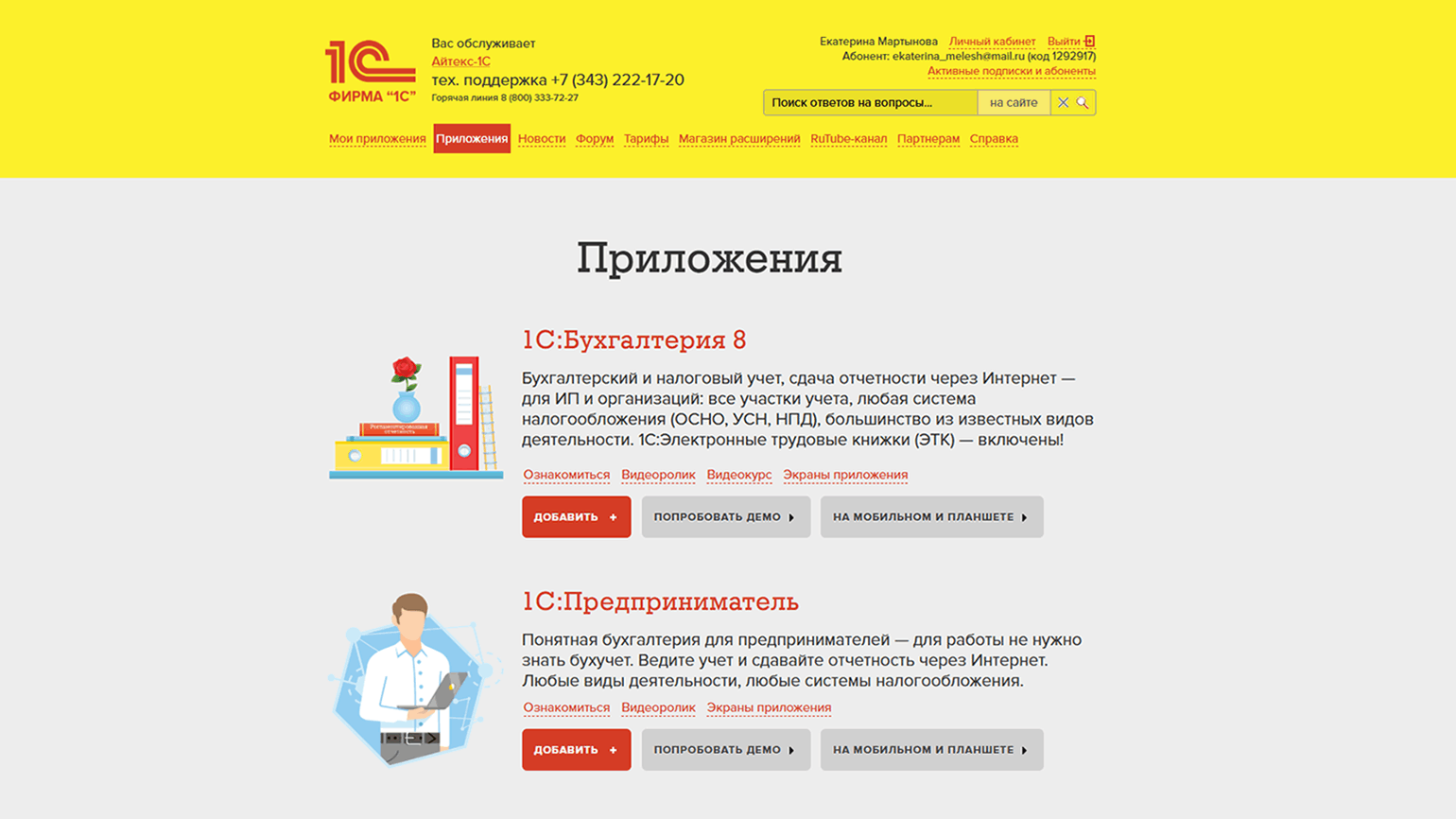 «ERP» — от 1900 рублей в месяц на одного пользователя, максимум пять пользователей. До трёх баз приложения «1С:ERP Управление предприятием», до десяти баз других приложений из списка «Базового» тарифа.