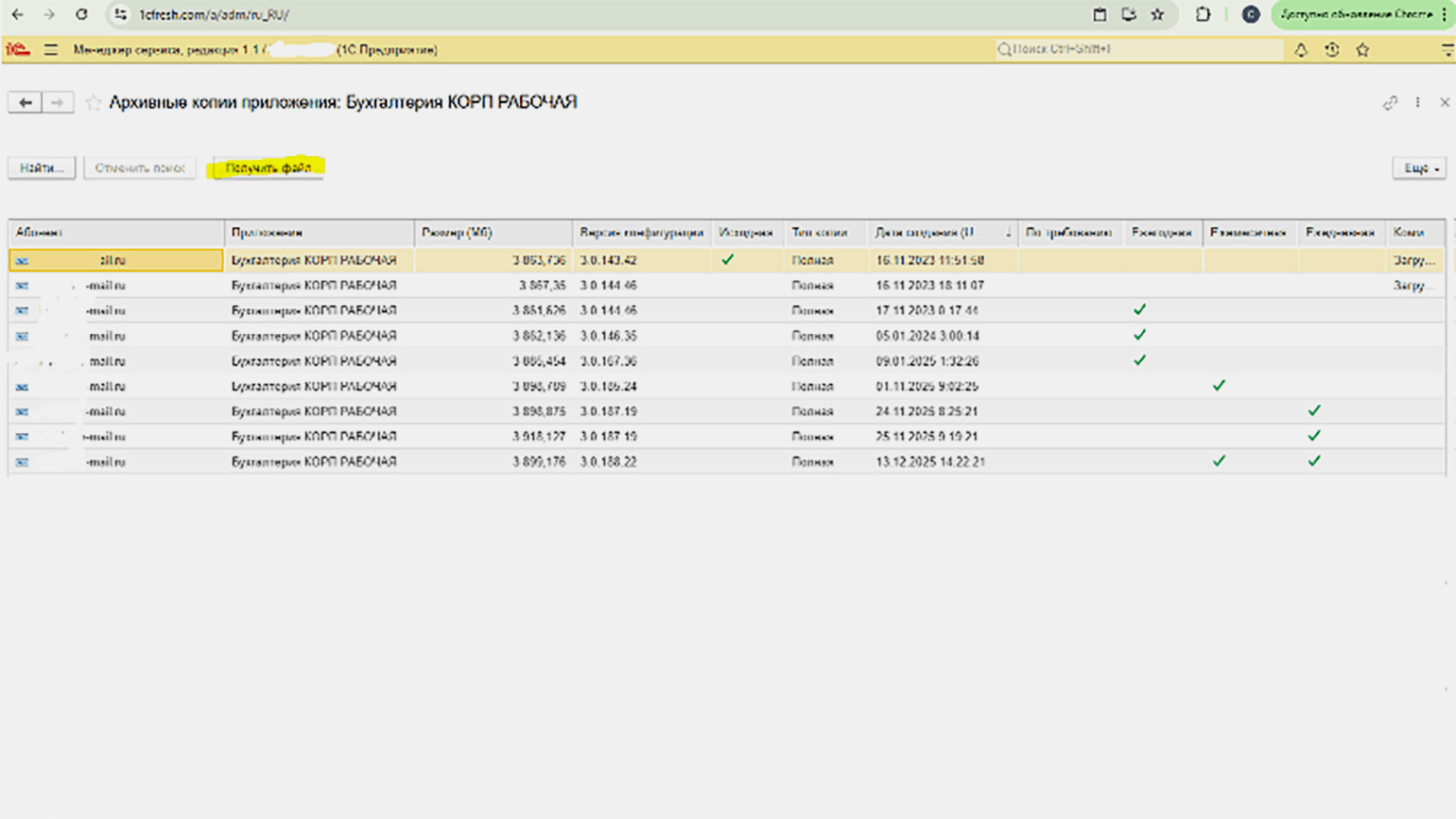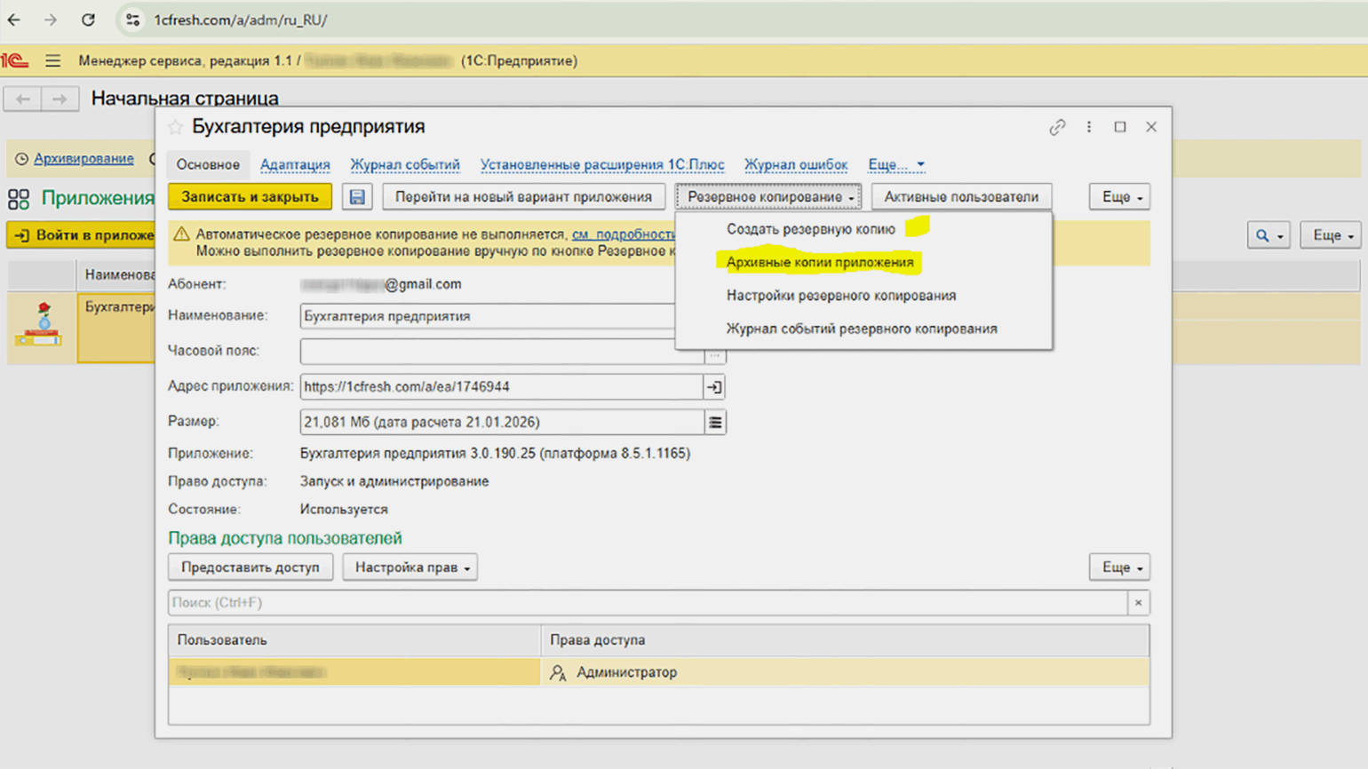 Согласно законодательству о бухгалтерском учёте, ответственность за сохранность данных несёт экономический субъект. Несмотря на то что «1С:Фреш» автоматически создаёт резервные копии по заданному расписанию, рекомендуется регулярно формировать собственные архивы.