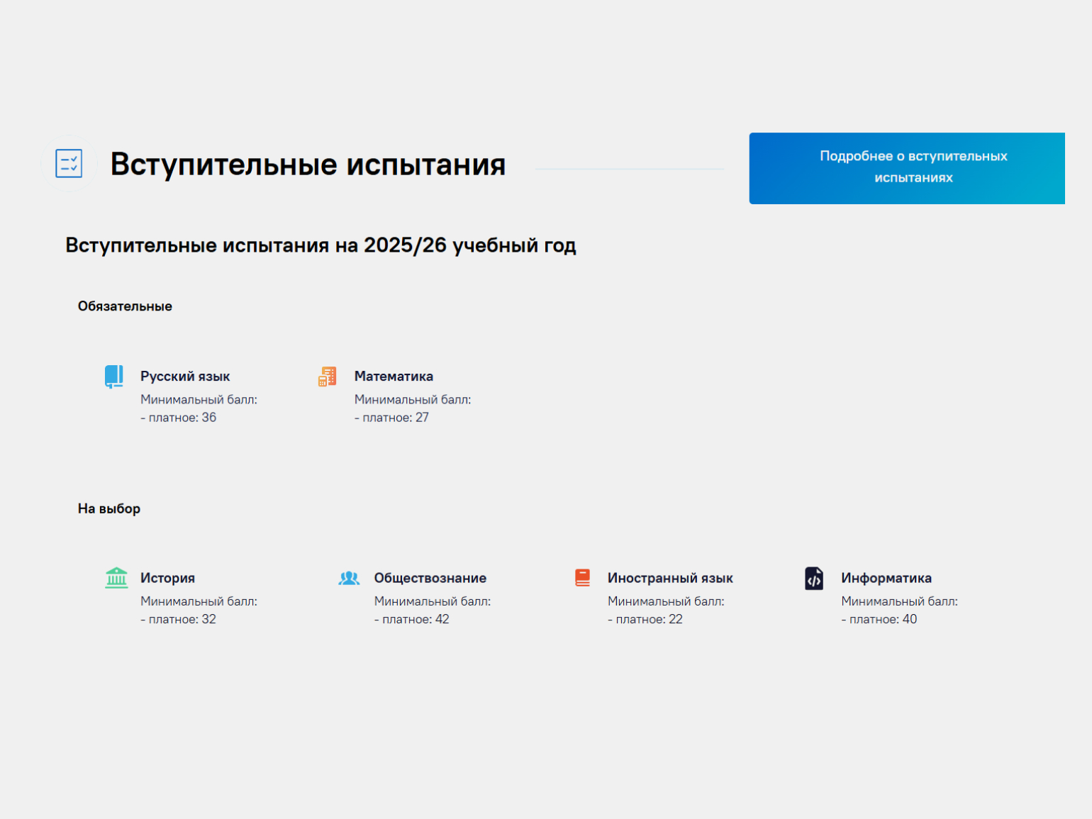 - После 9-го класса в колледж поступают по среднему баллу аттестата; иногда учитываются результаты собеседования или личные достижения. После 11-го класса для поступления в вуз нужны результаты ЕГЭ: русский язык, профильная математика и третий предмет — обычно обществознание или информатика.