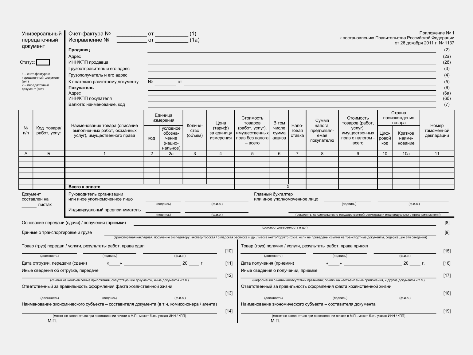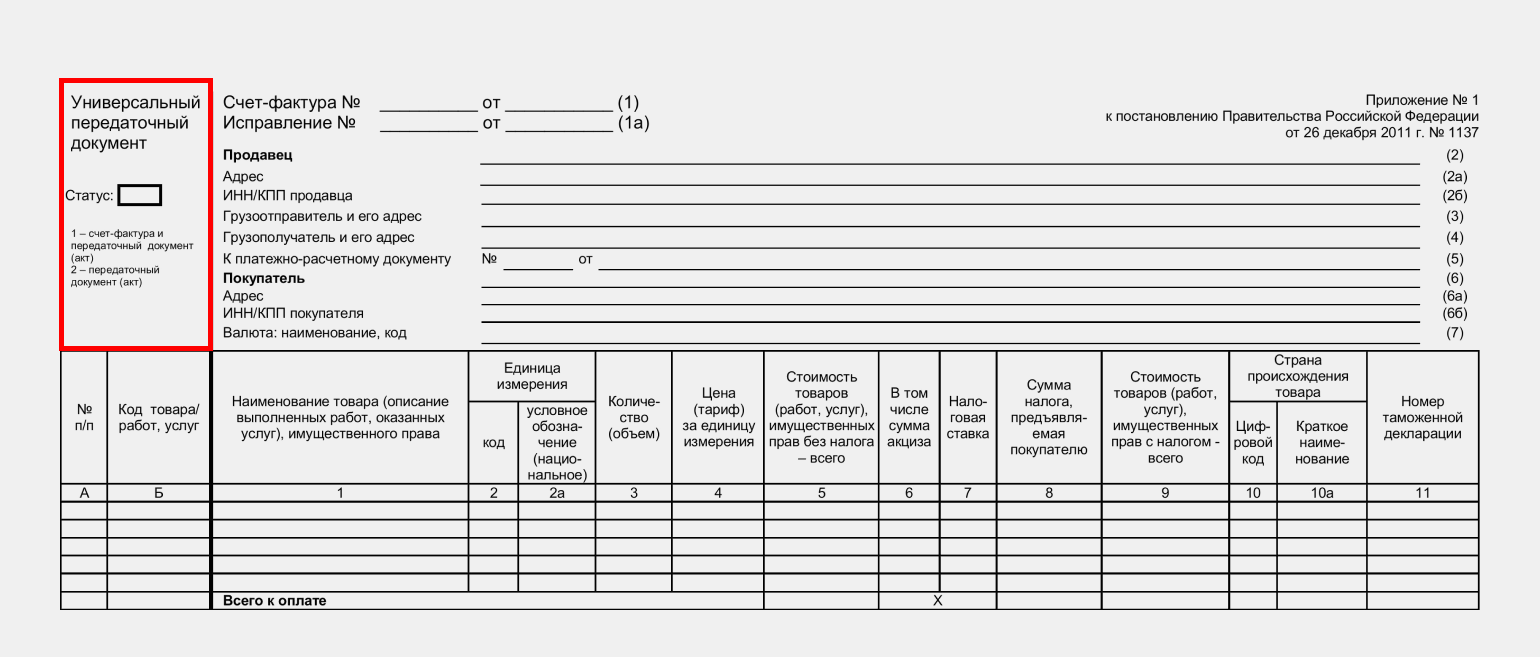 Если код статуса 1, к первичному документу добавляются функции счёта-фактуры. Это значит, что при заполнении нужно учесть требования пунктов 5 и 6 статьи 169 НК РФ и Правил заполнения счетов-фактур, утверждённых Постановлением Правительства от 26.12.2011 №1137.