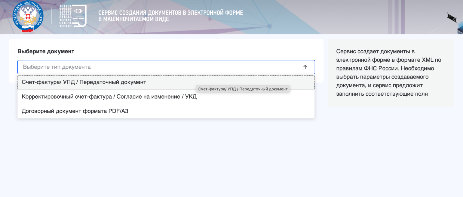 В интернете есть разные конструкторы, позволяющие заполнить УПД онлайн и бесплатно. Например, на сайте ФНС есть «Сервис создания документов в электронной форме в машиночитаемом виде».