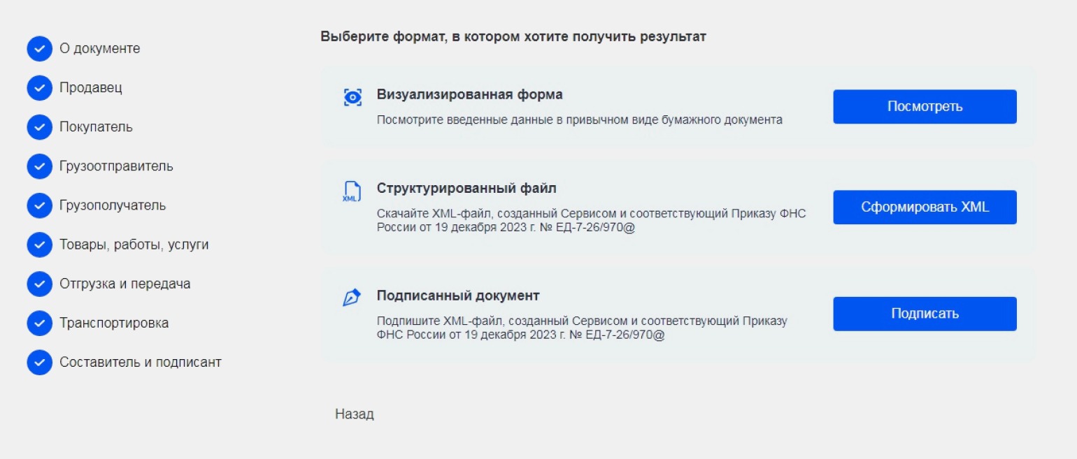 В результате сервис предлагает выбрать формат, в котором вы хотите получить заполненную форму УПД: в виде бумажного документа или в формате XML-файла. Также здесь можно подписать подготовленный УПД электронной подписью.