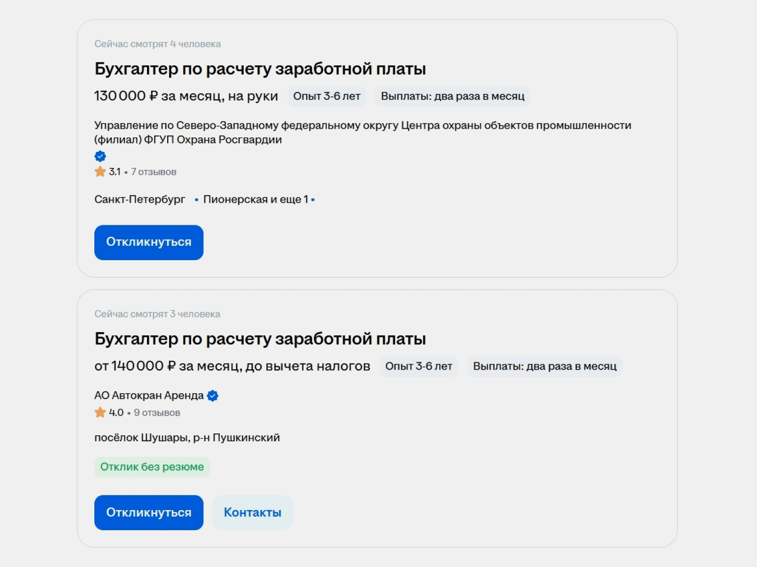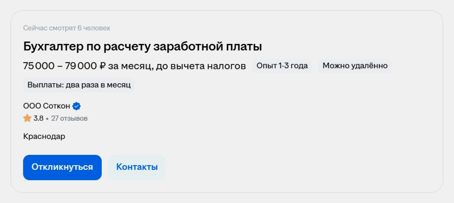 В Москве аналогичную зарплату предлагают бухгалтерам со стажем 1–3 года. Более опытные специалисты могут получать от 150 тысяч рублей.