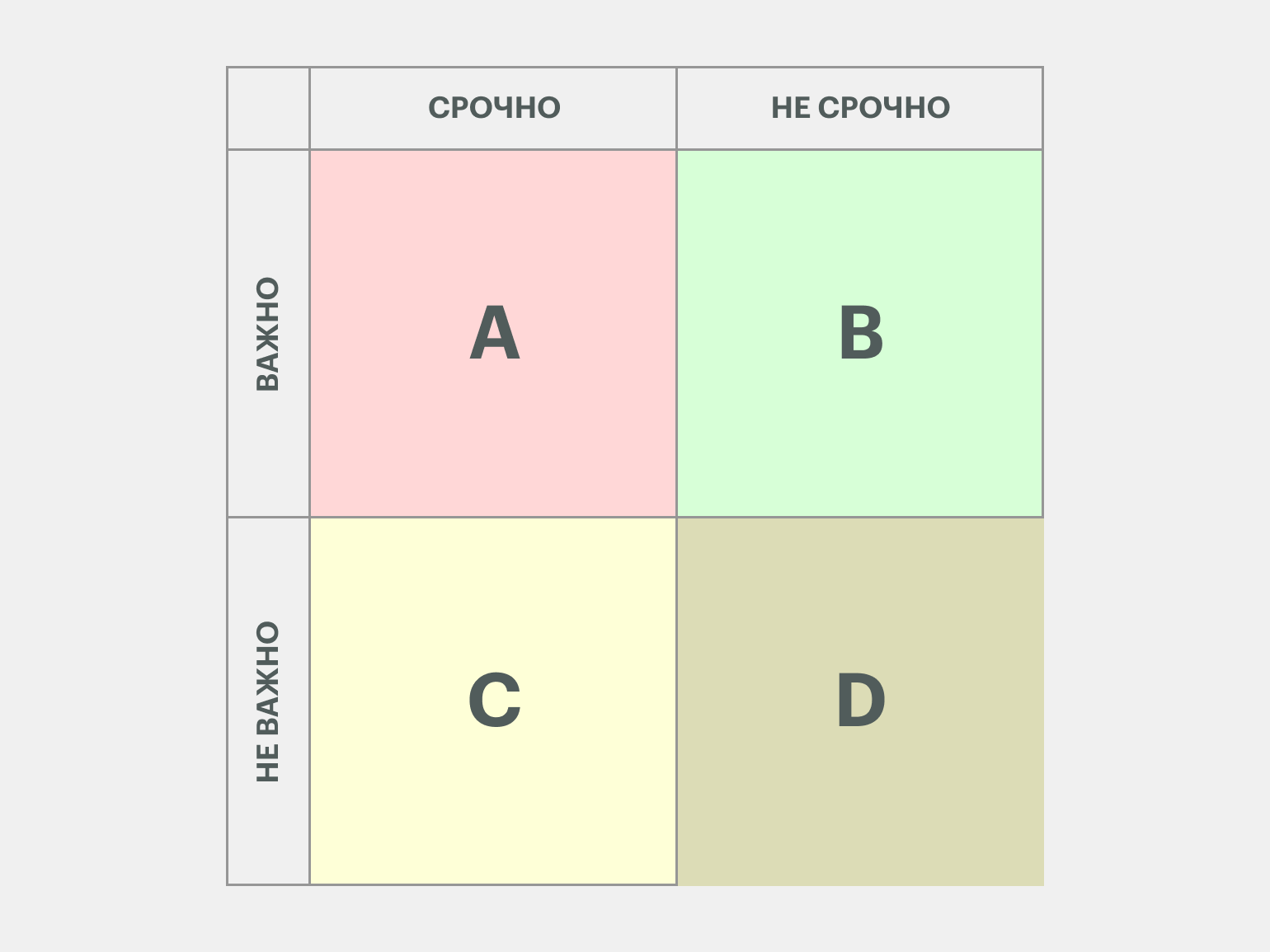 - Задачи в матрице делятся на четыре группы — важные и срочные (A), важные, но несрочные (B), срочные, но неважные (C) и несрочные и неважные (D).