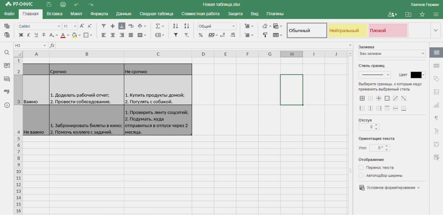 В офисном редакторе. Также матрицу Эйзенхауэра можно построить в офисных редакторах — в виде таблицы в формате XLS. Вот матрица, оформленная в сервисе «Р7-Офис»: