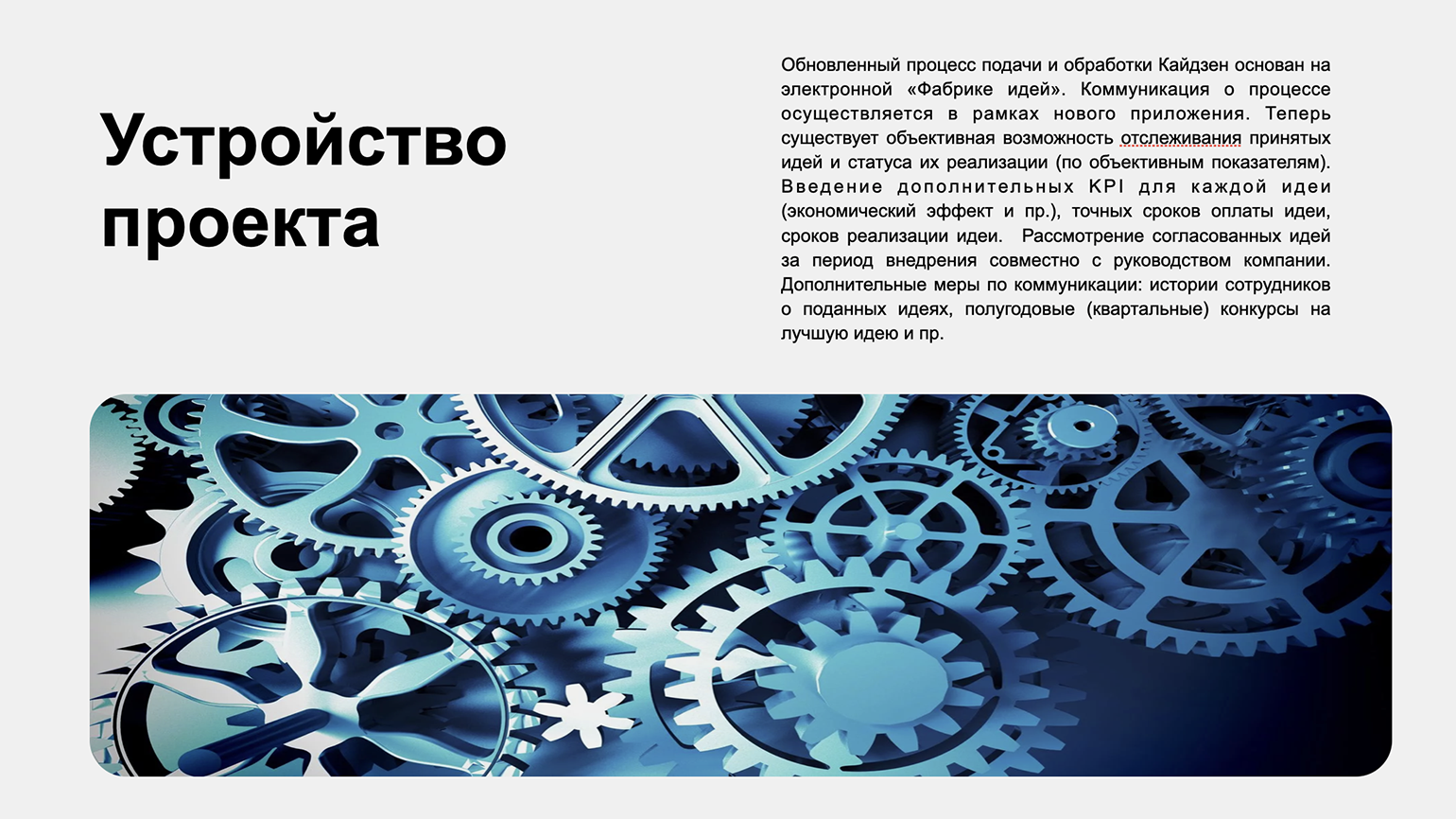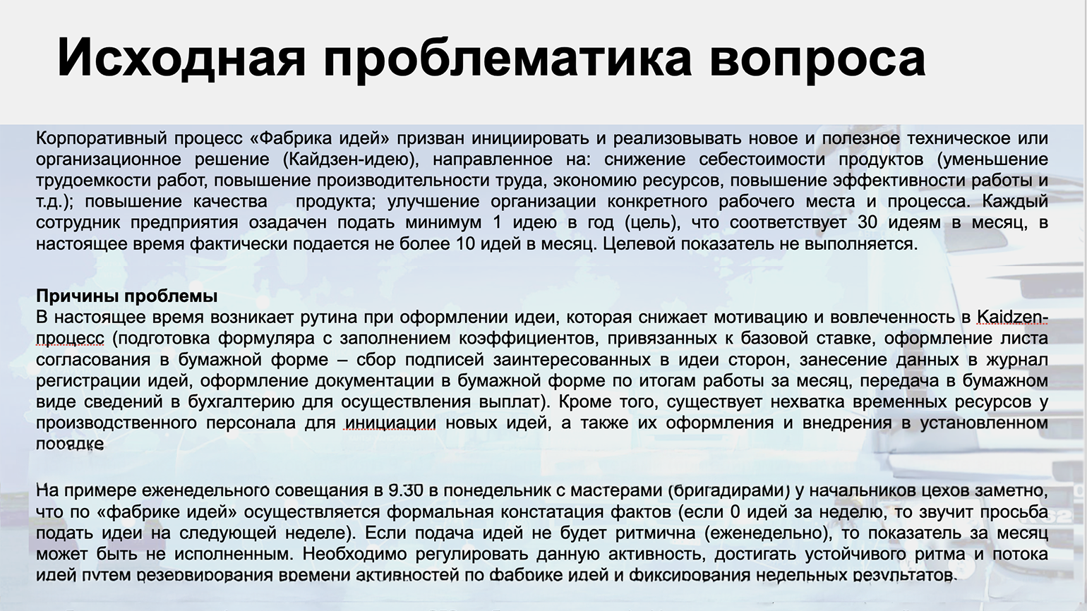 В финале мы остановились на проекте по автоматизации кайдзен-процесса нашей компании. Это было актуально, понятно и давало прямую практическую пользу как в учёбе, так и в работе.