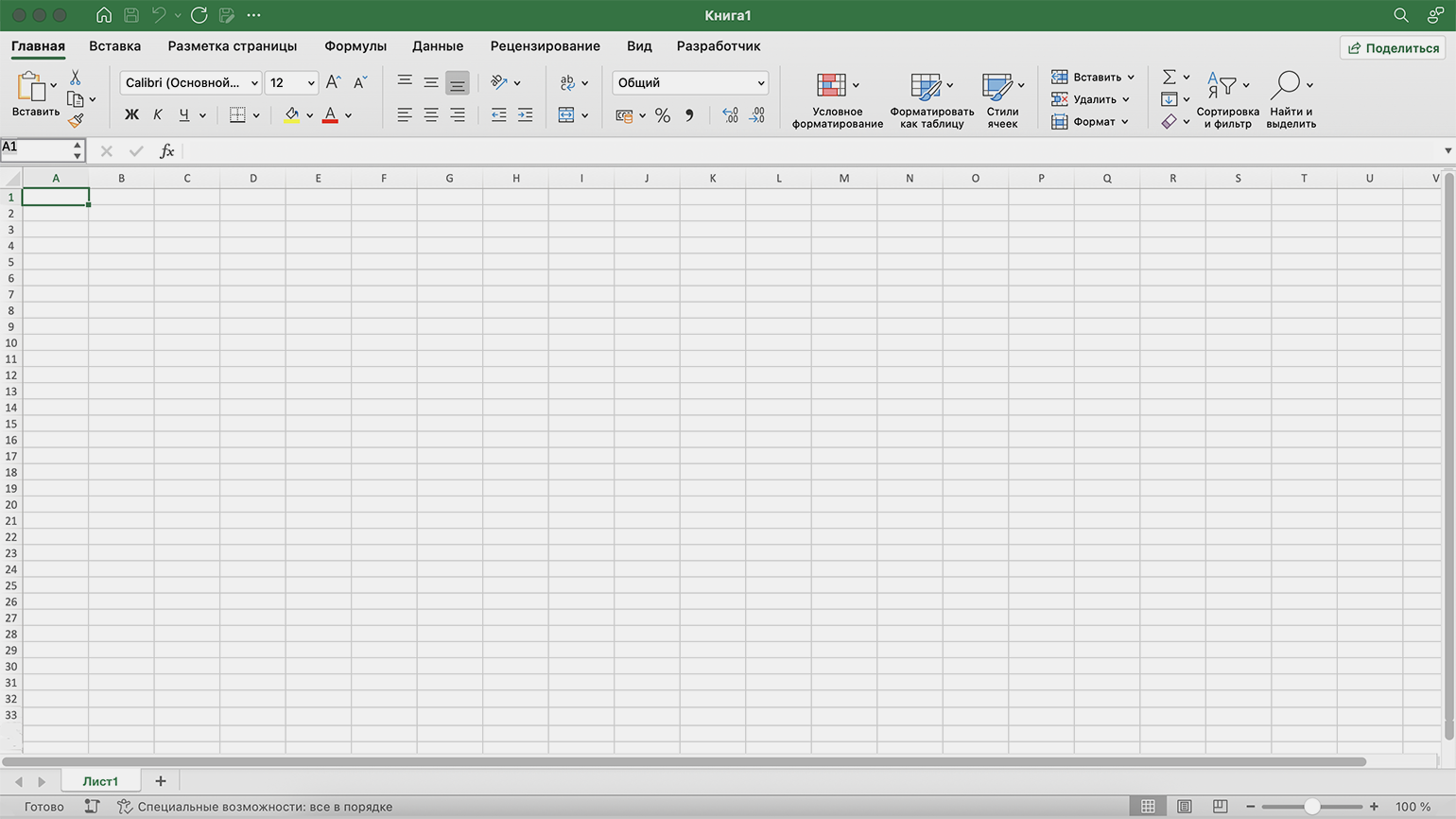 Откроется пустая страница, в которой можно работать. Подробнее об интерфейсе Excel — обо всех панелях и вкладках — говорим в следующем разделе.