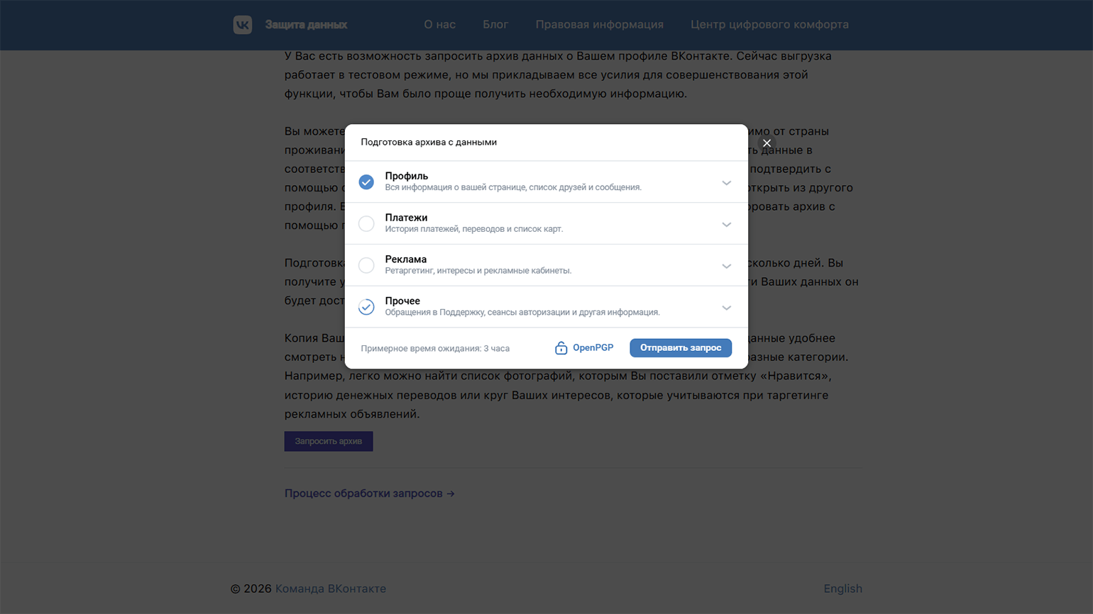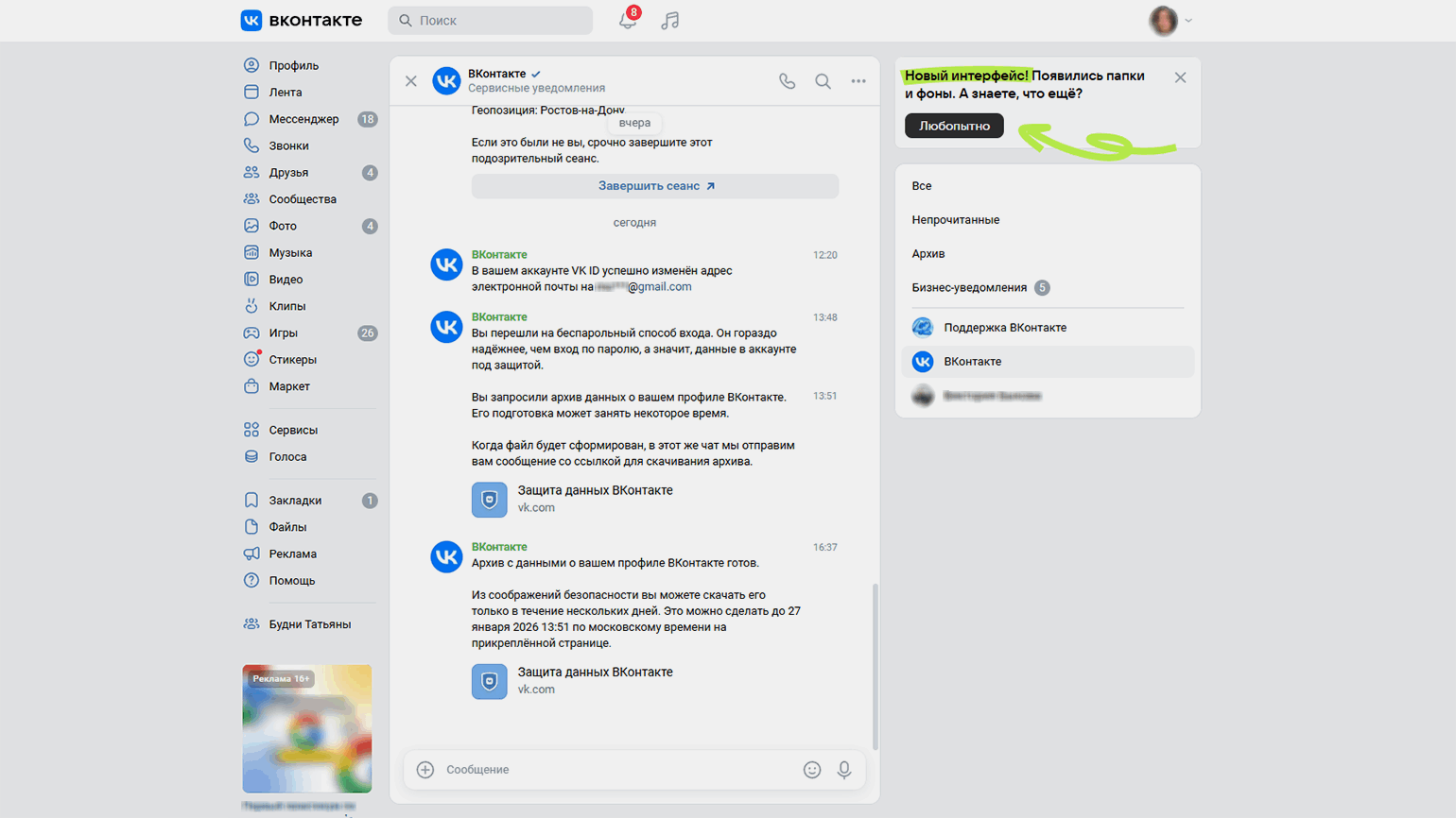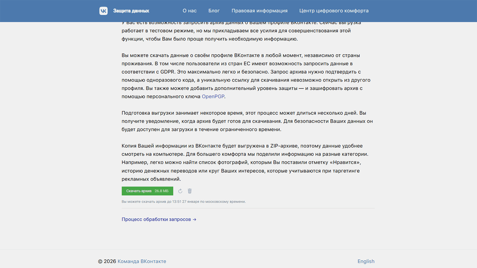 После одобрения запроса в личных сообщениях появится системное уведомление о том, что архив запрошен и готовится. Через пару часов в этот же диалог пришлют ссылку на скачивание архива.
