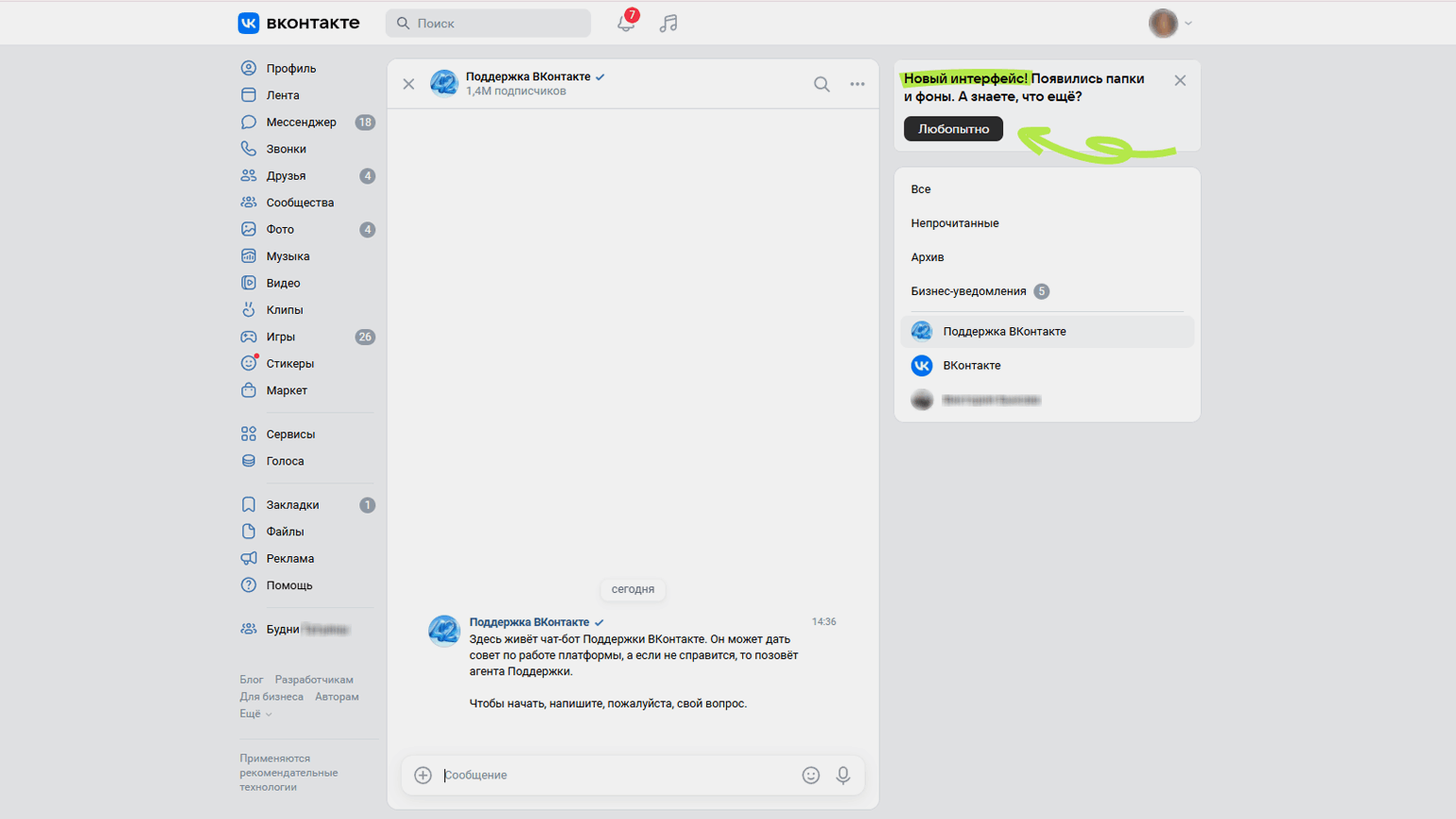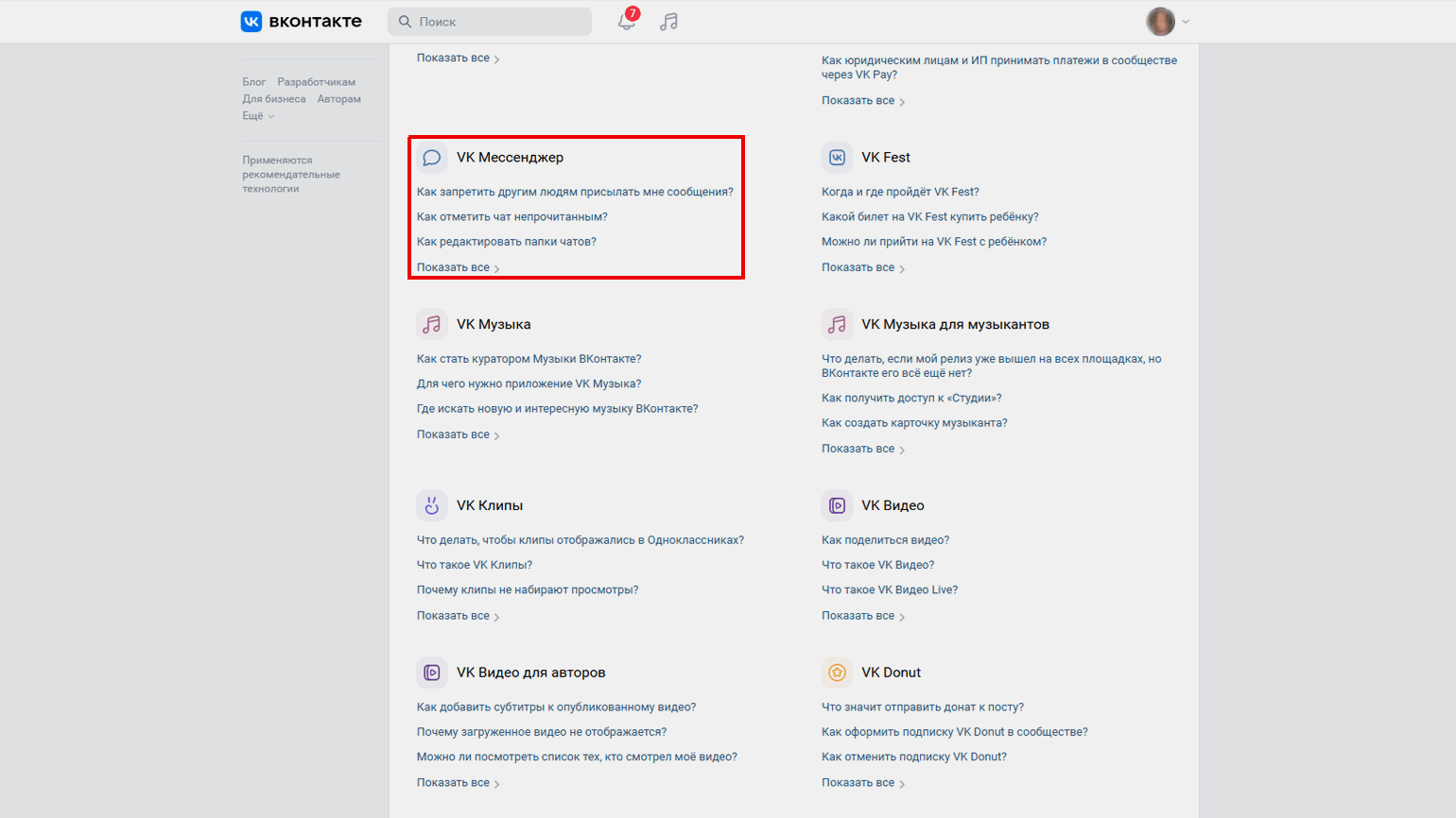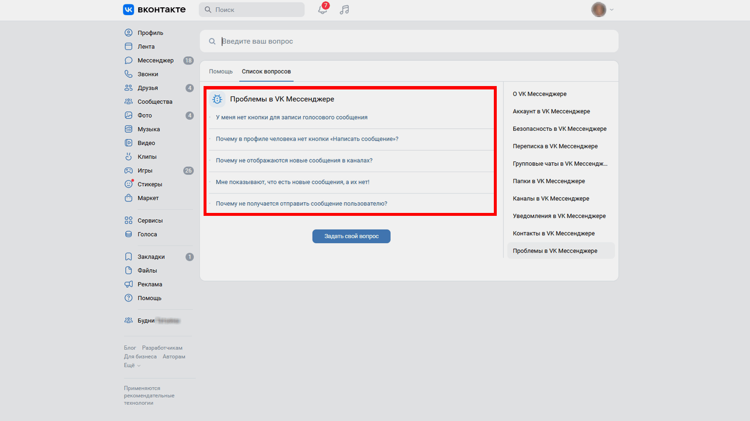 В правой части экрана находится меню — в нём нужно нажать на пункт «Проблемы в VK Мессенджере». После этого в самом низу страницы появится кнопка «Задать свой вопрос». Нажмите на неё — откроется чат с поддержкой.