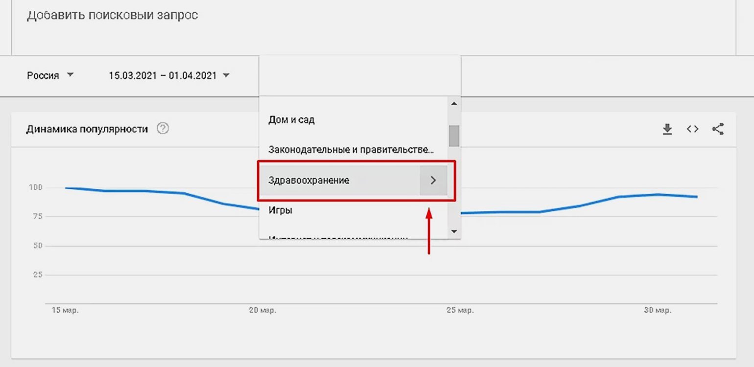 Далее выбираем необходимую для нас тематику. Подходит «Здравоохранение». Кликнув на стрелку, можно сузить направление.