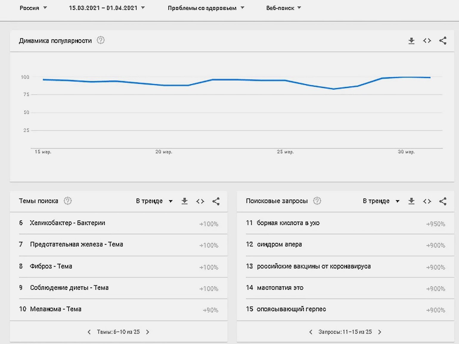 Идеально залетает пункт «Проблемы со здоровьем». Оставим «Веб-поиск» — это позволит получить максимально широкую выборку.