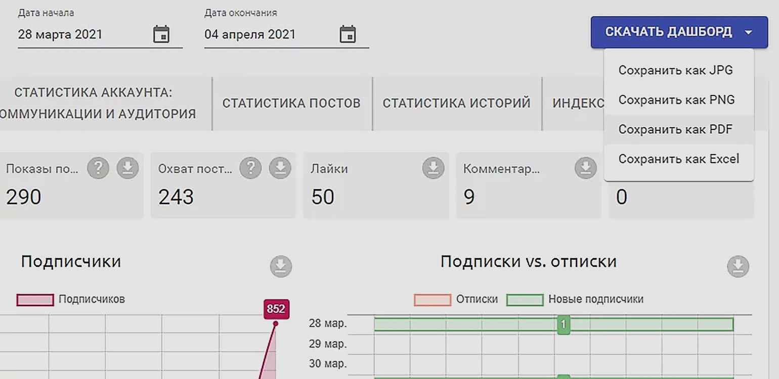 Только появляется потребность, и необходимая статистика из «ВКонтакте» и «Одноклассников», Facebook* и Instagram*, оформленная в дашборды, моментально экспортируется в один из популярных форматов сервисов для бизнес-аналитики: MS Power BI, Google Data Studio или MS Excel.