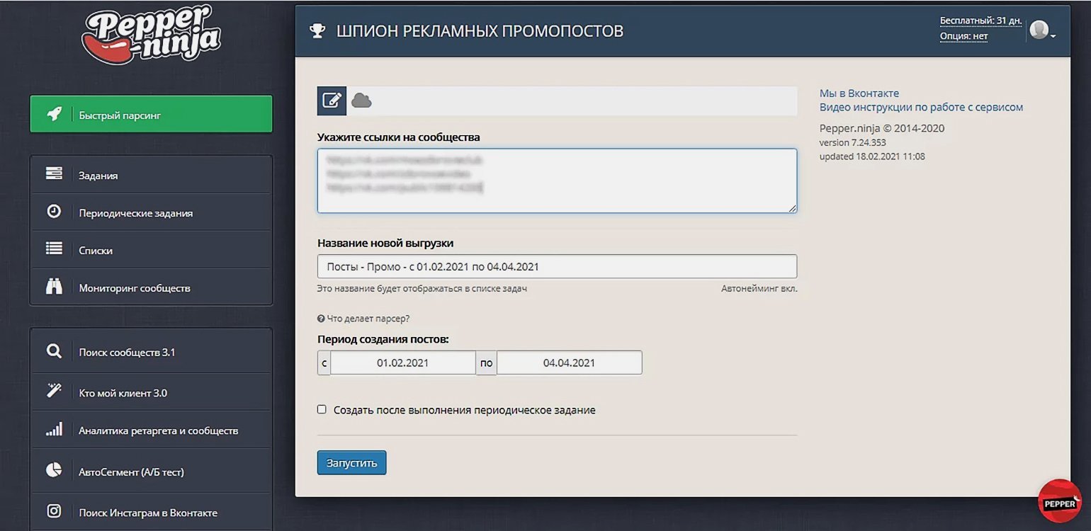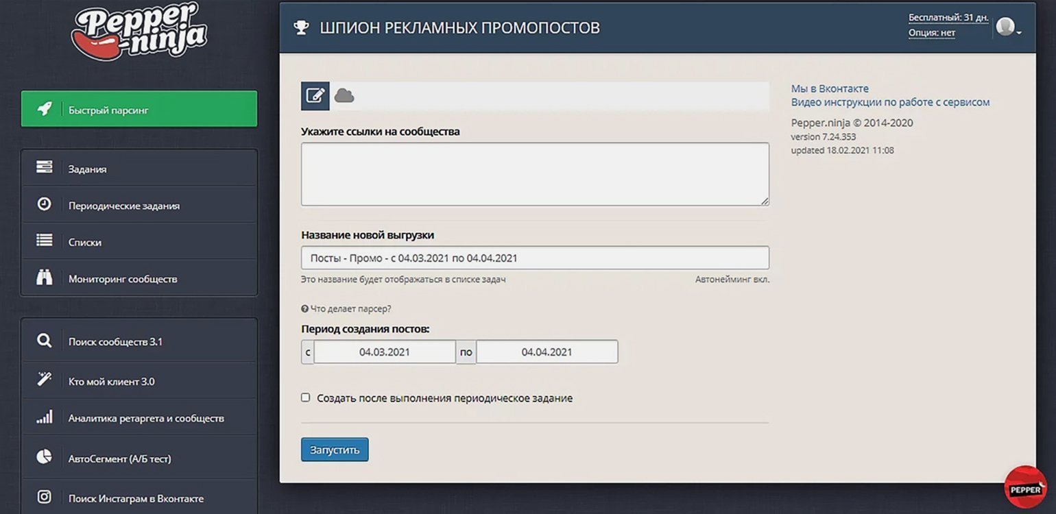 Заходим в парсер Pepper.Ninja, в боковом меню выбираем: «ВКонтакте» → Посты → Шпион промопостов. Это доступно даже в бесплатном периоде.
