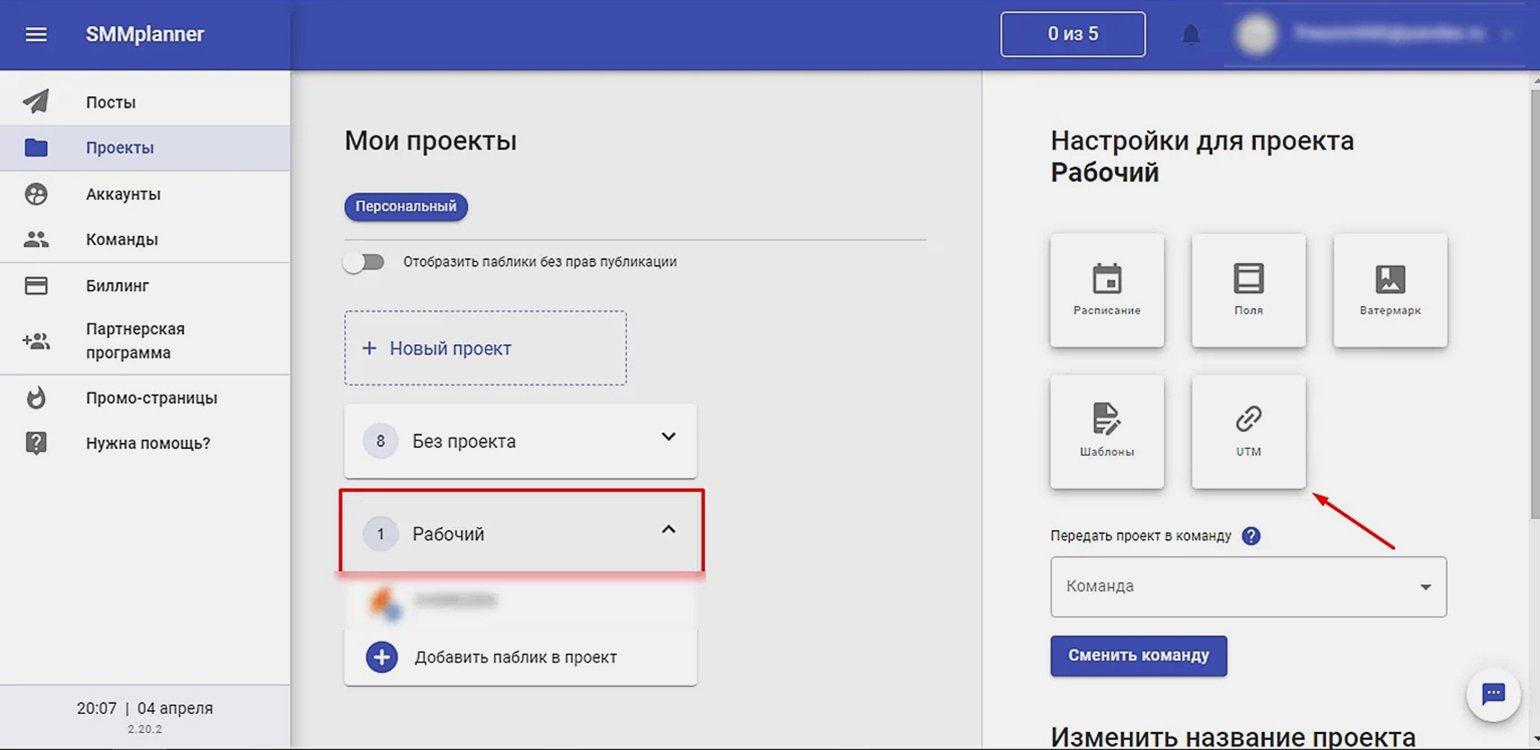 После этого выбрать свой рабочий проект — в правом боковом меню появятся кнопки выбора дополнительных функций и настроек.