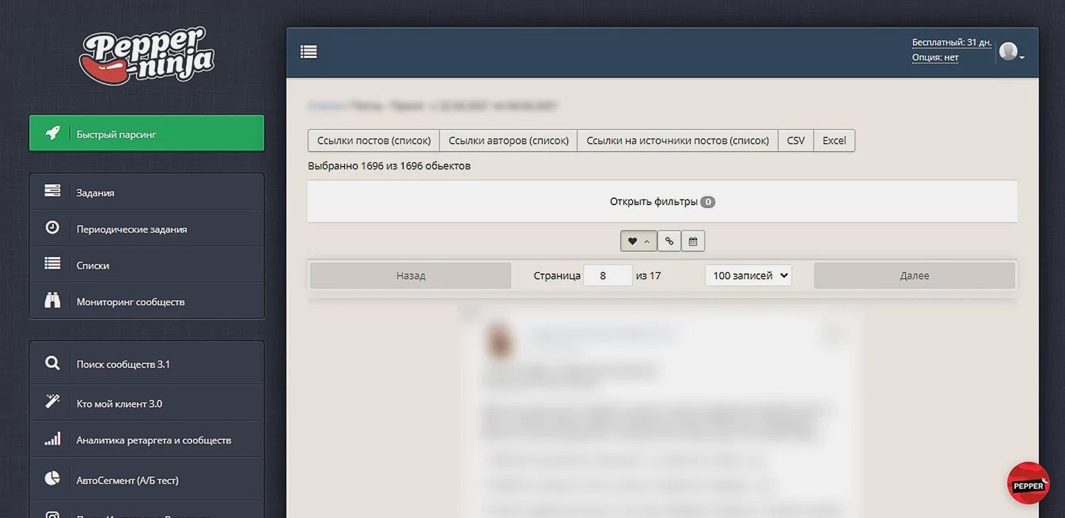 Можно все результаты выгружать списками в разных форматах. Пользоваться фильтрами по словам, количеству лайков, переходов по ссылкам в формате «от… до…».