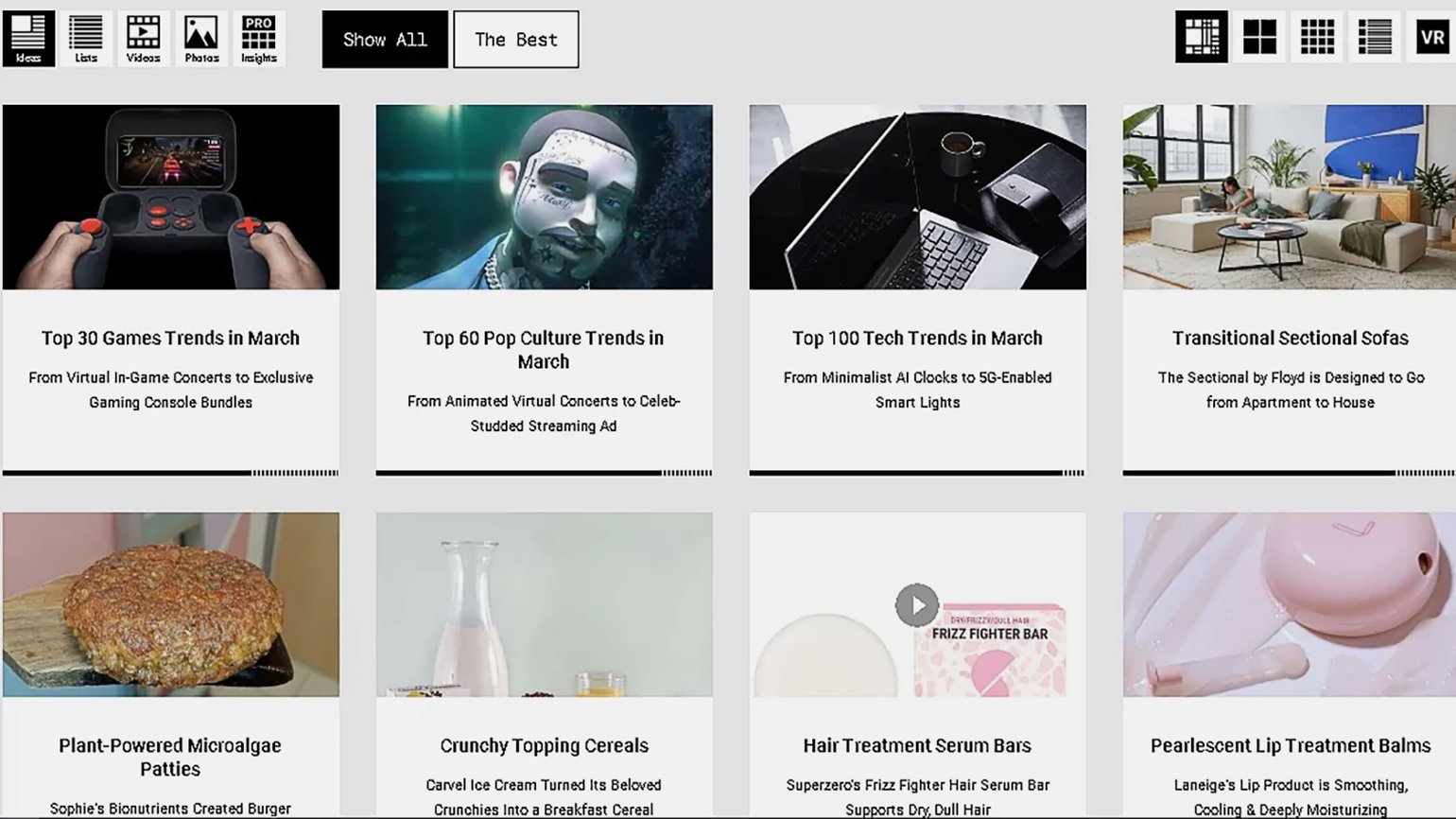 Insights — настоящая сокровищница с трендовыми идеями и тенденциями, которые сейчас набирают популярность в мире. Всё подкрепляется статистическими данными. А для удобства есть каталог тем.