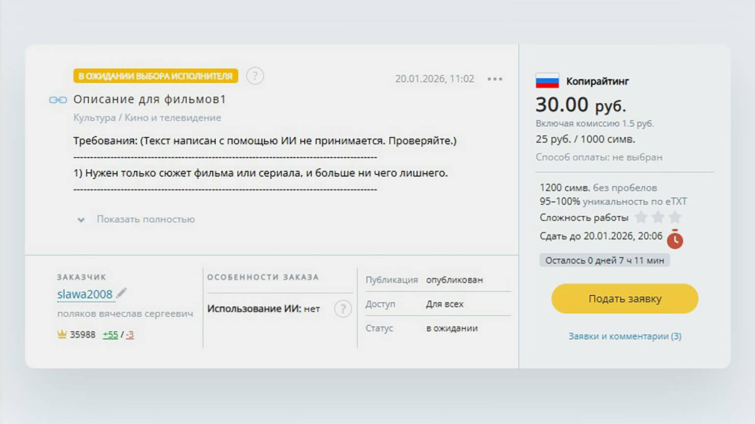 В каждом заказе обычно есть вся информация о контенте, который нужно сделать. Заказчики описывают формат текста, его объём, тему, требования к уникальности и другие условия. Можно изучить задачу — и принять решение, хотите ли вы брать её в работу.