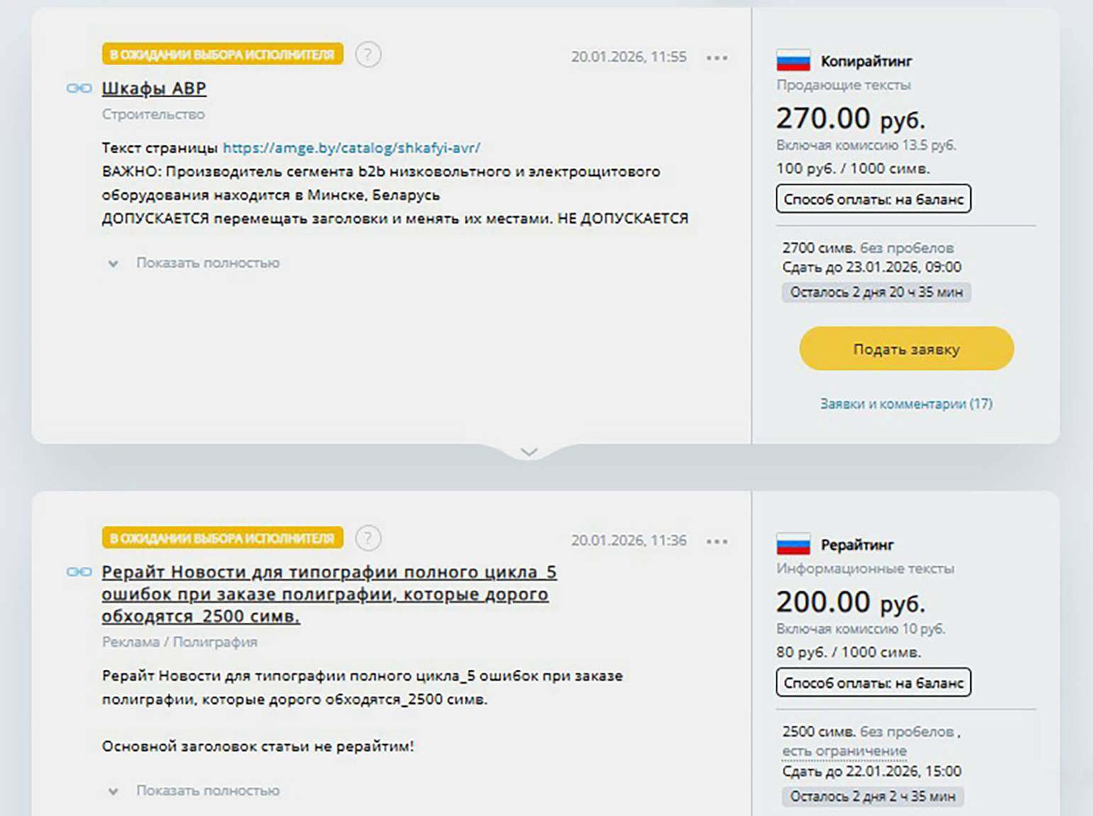Цены — минус, который упоминают чаще всего. Стоимость проектов на бирже в среднем действительно заметно ниже стоимости проектов, которые можно найти на других площадках. Так, на биржах встречаются заказы, в которых предлагают оплату 20–30 рублей за тысячу символов. Или проекты, в которых платят 300 рублей за статью, на которую придётся потратить минимум четыре часа.