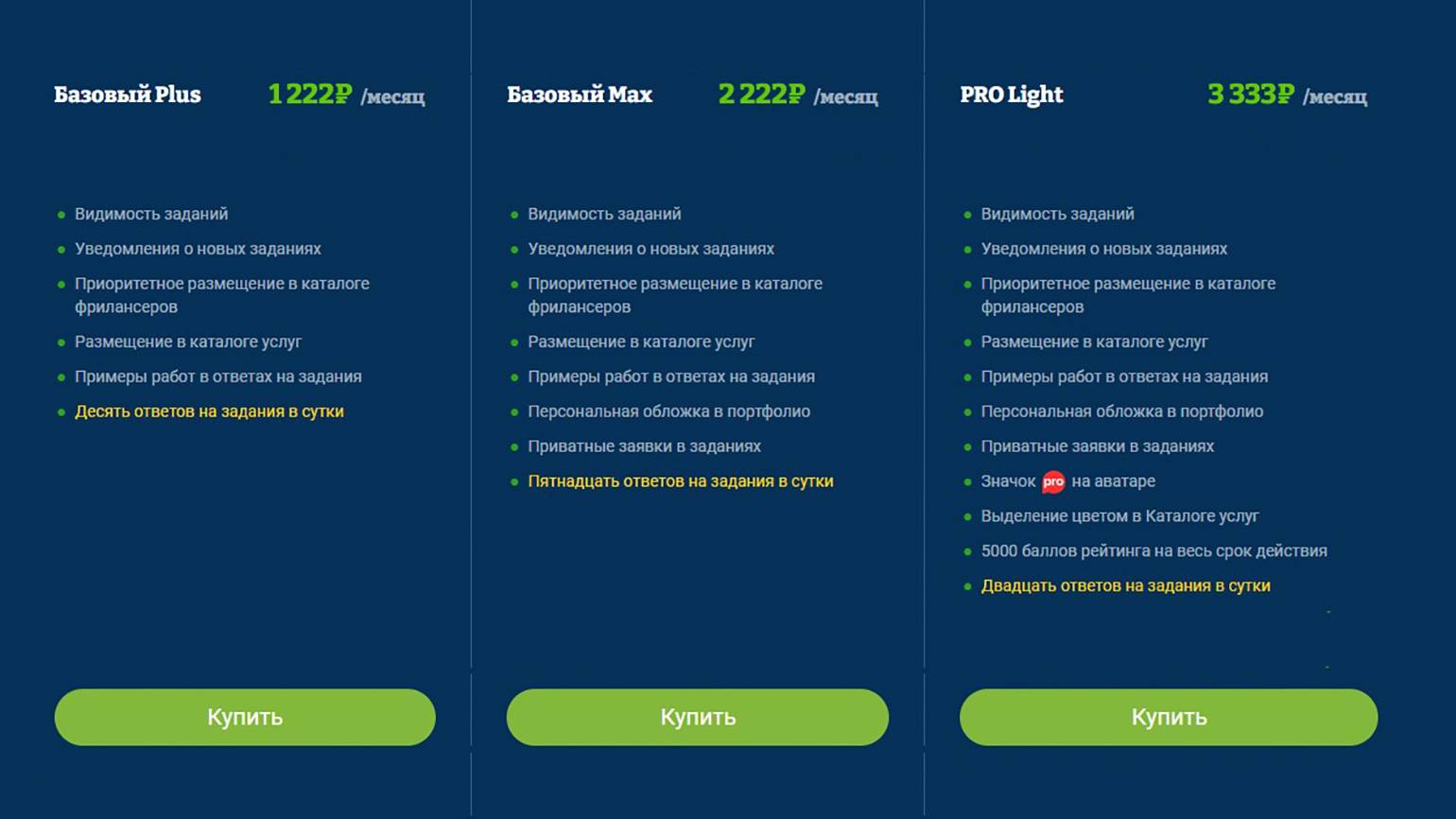Активность исполнителей на Freelance ограничена — так, они не могут отправлять неограниченное количество откликов на заказы, в отличие от бирж копирайтинга. В день можно отправить до трёх откликов; если нужно больше, можно купить пакет откликов. Или оплатить премиум-аккаунт — он стоит от 1222 рублей в месяц и даёт и другие возможности, например позволяет получать уведомления о новых заданиях.