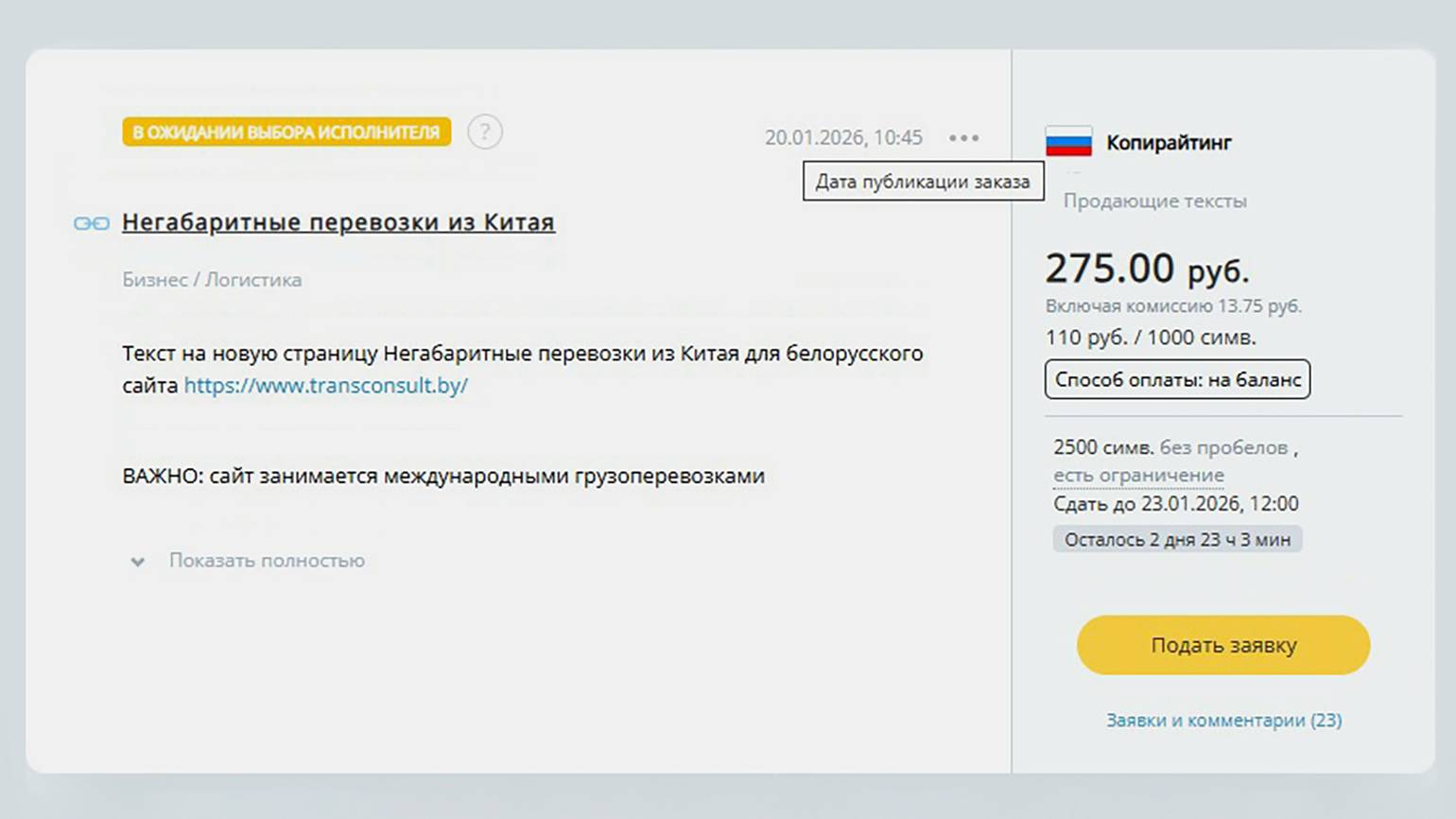Подавать заявки. На большинстве бирж нельзя самостоятельно взять заказ — нужно подать заявку на него и дождаться, пока заказчик её одобрит. Тогда задача поступит в работу, и можно будет её выполнять. Чтобы повысить шанс на то, чтобы клиент выбрал вас, можно описать релевантный опыт, показать примеры работ или подчеркнуть ваши преимущества — например, то, что вы работаете в паре с экспертом по теме.