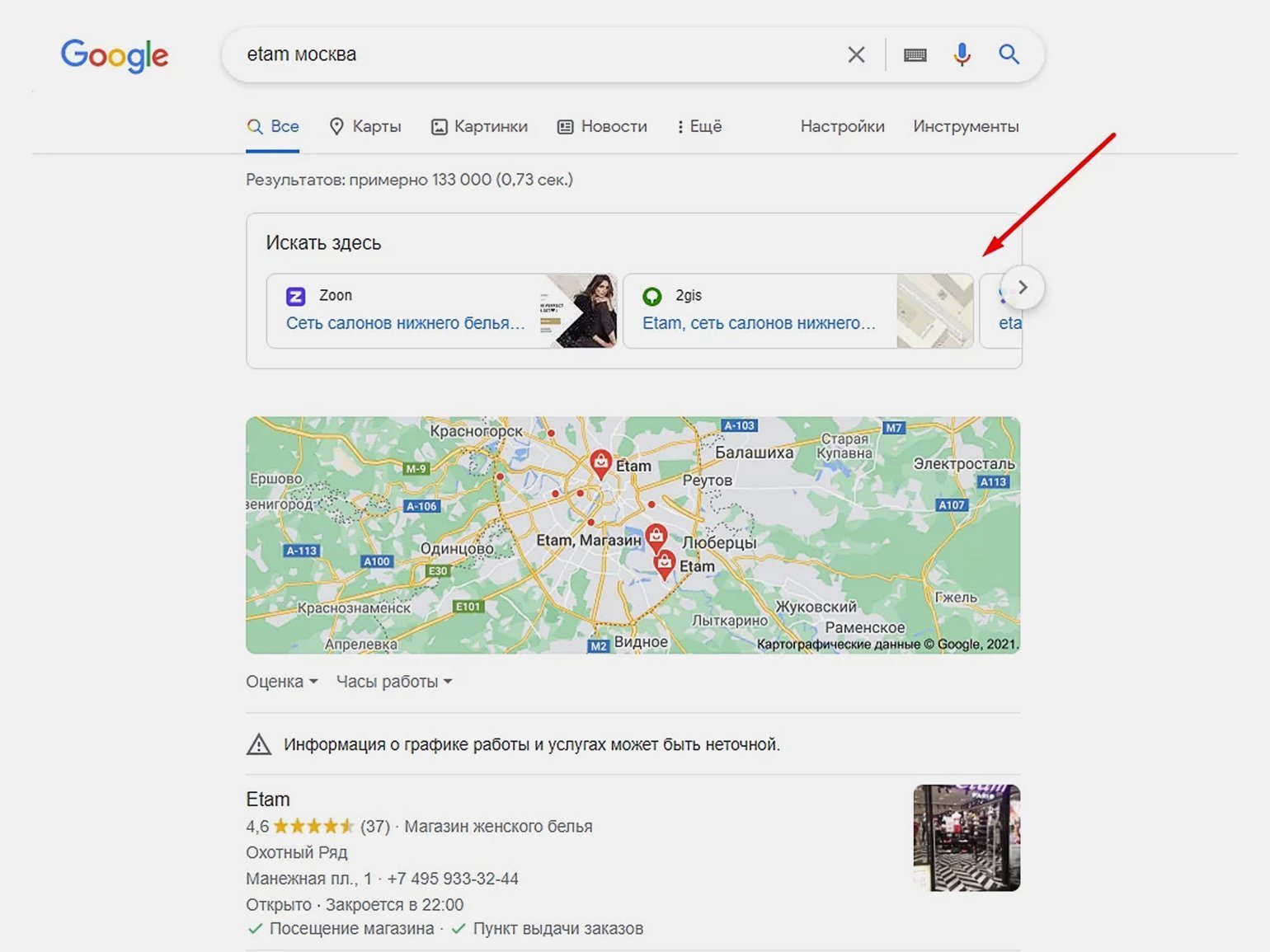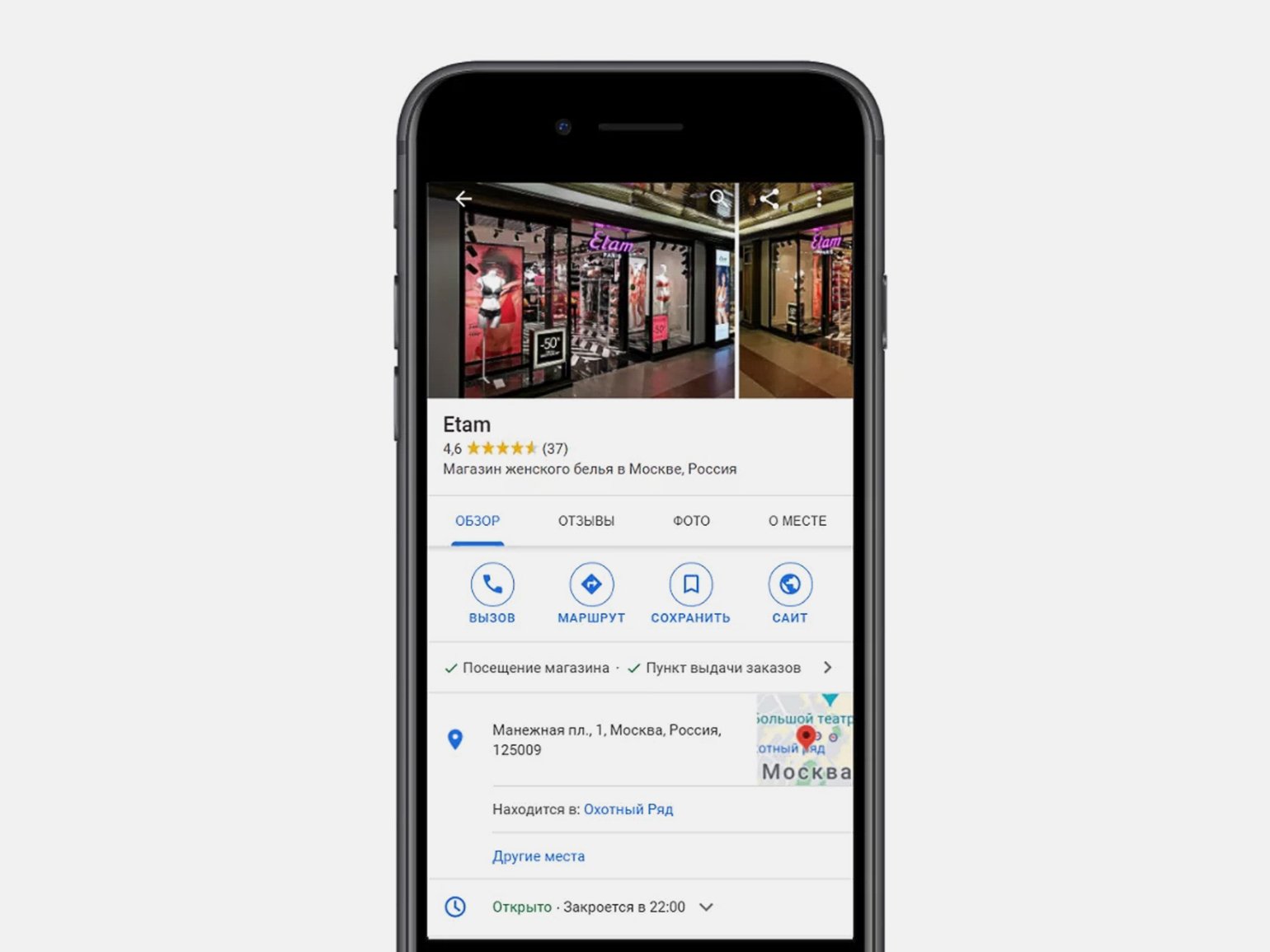 1. Каждый магазин Etam представлен в популярных геосервисах, карточки верно заполнены. Можно увидеть, как Google предлагает пользователю выбрать любой удобный ему геосервис, чтобы найти магазин компании: