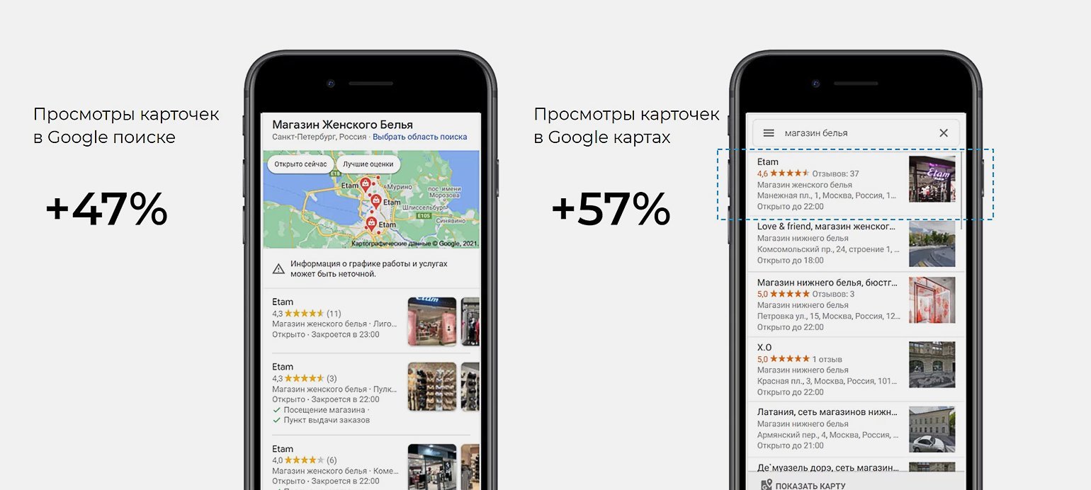 2. То, что карточки заполнили верно, отразилось на ранжировании. Уже через полгода видимость Etam в Google Search выросла на 47%, а в Google Maps — на 57%:
