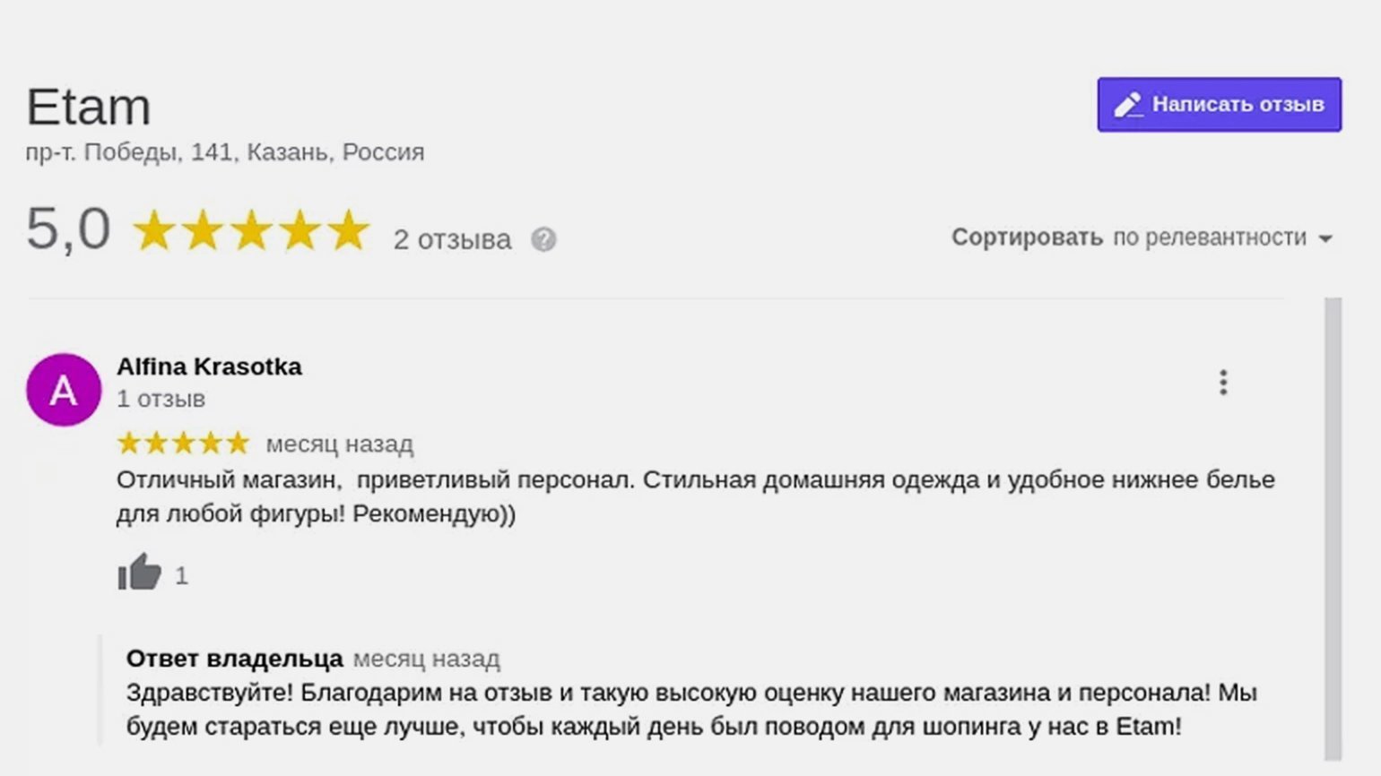Etam получает уведомления о новых отзывах, которые клиенты оставляют в карточках геосервисов, и оперативно отвечает на них, вовремя нивелирует негатив и поддерживает лояльность покупателей.
