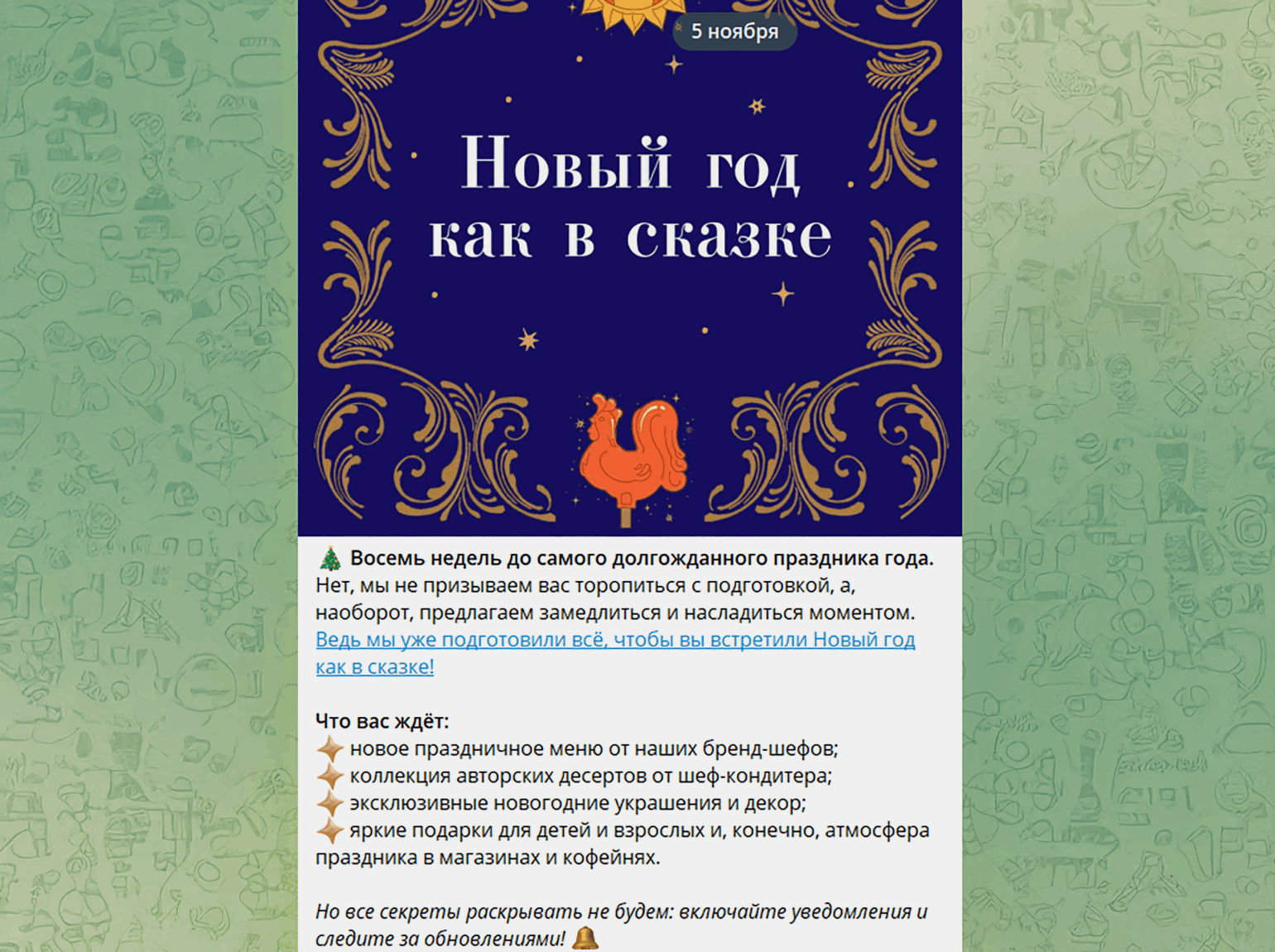 Даже небольшой ситуатив помогает напомнить о себе и решить задачи бизнеса. По словам владелицы SMM-агентства Volga Насти Сучковой, использование темы Нового года имеет смысл только при одном условии: у бренда достаточно ресурсов, чтобы сделать это достаточно хорошо. Не ярче всех, не креативнее рынка — а просто качественно, понятно и в соответствии с задачами бизнеса.