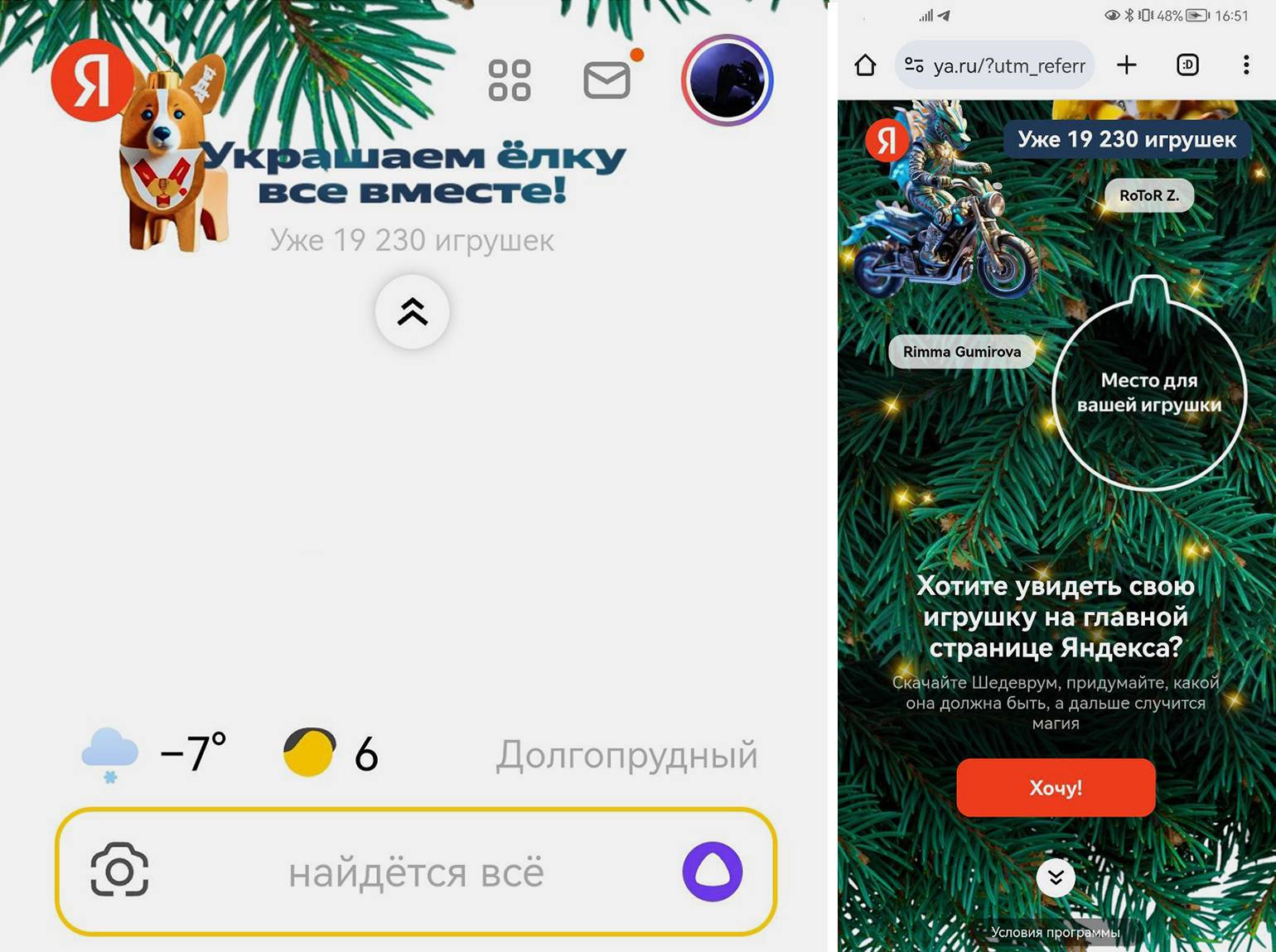 В декабре 2023 года «Яндекс» запустил бесконечную новогоднюю ёлку. Чтобы её увидеть, достаточно было открыть поисковик: пользователь попадал на огромное интерактивное дерево, на котором каждую минуту появлялись новые игрушки.