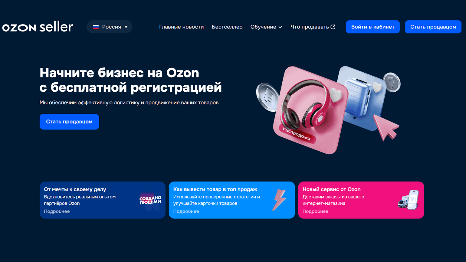 Давайте рассмотрим процесс регистрации личного кабинета селлера на Ozon. Для начала нужно перейти на Ozon Seller — это сайт для продавцов.