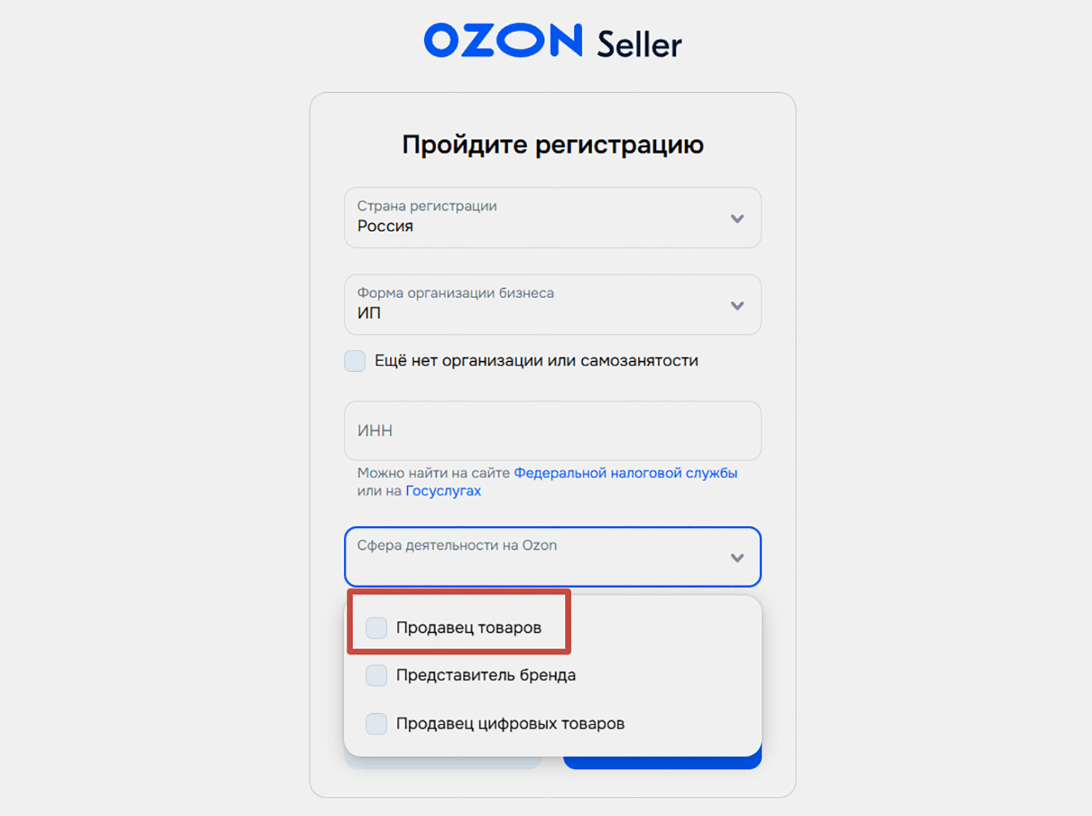 В поле «Сфера деятельности» выберите свою форму взаимодействия с маркетплейсом. Если вы торгуете физическими товарами, ваш выбор — «Продавец товаров».