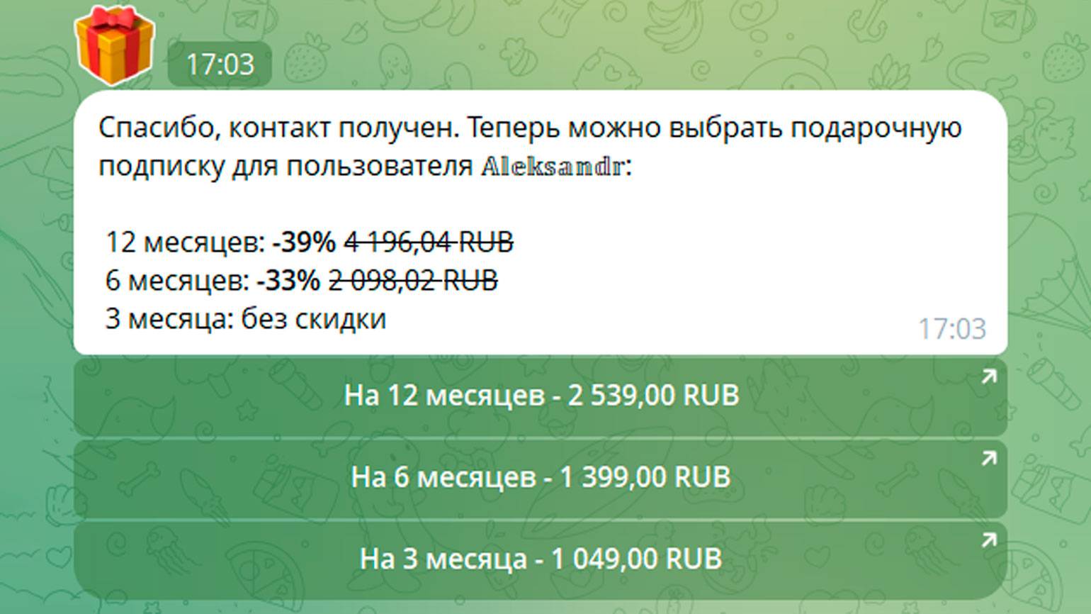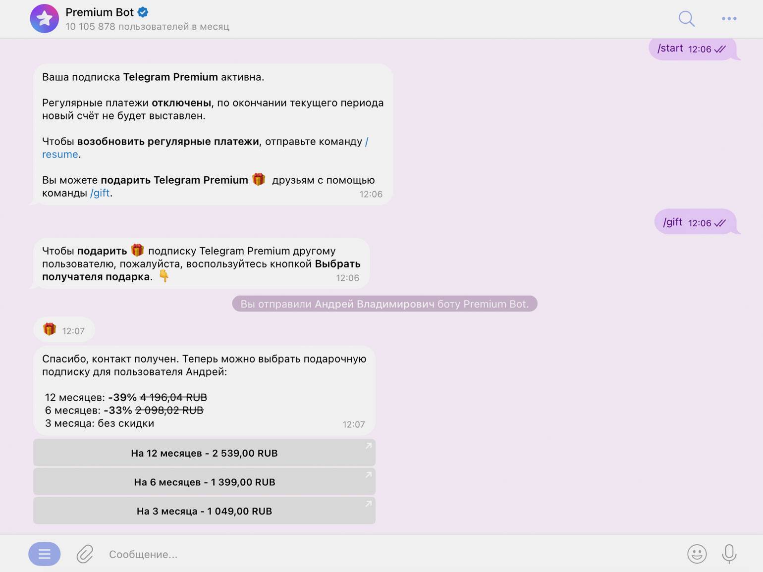 Далее выберите срок подарочной подписки и оплатите её. После оплаты получатель получит доступ к премиум-функциям Telegram на выбранный период.