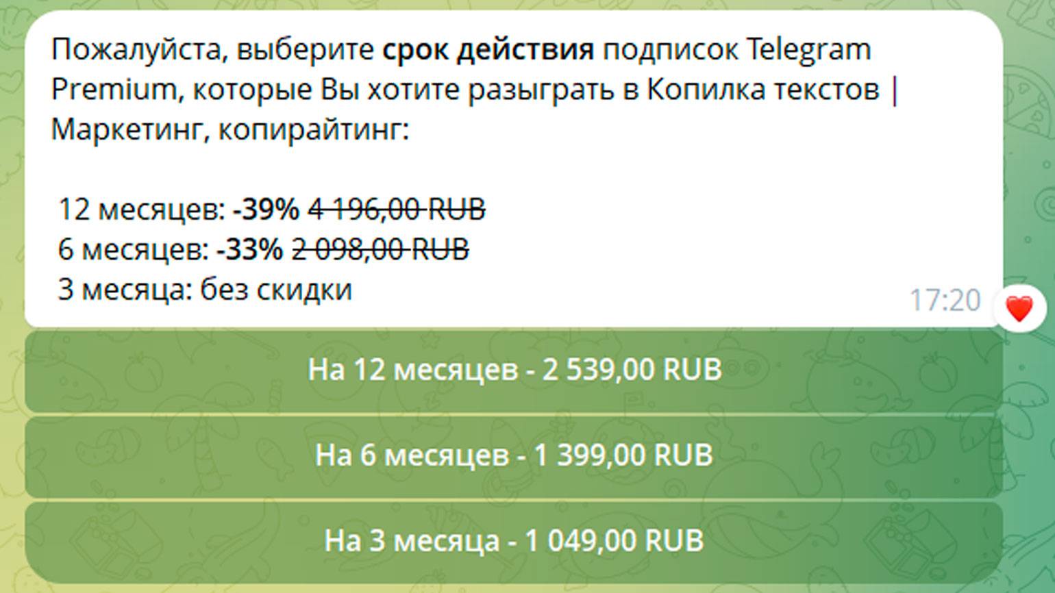 При оплате через официального бота Premium Bot в России подписка для смартфонов с Android стоит:
