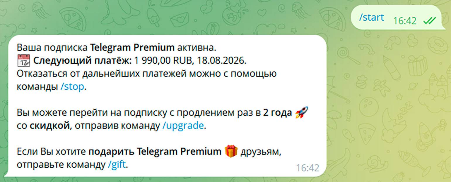 Посмотреть, до какого периода действует подписка, можно через Premium Bot: для этого нужно нажать на кнопку /start или ввести эту команду в диалоговое окно.