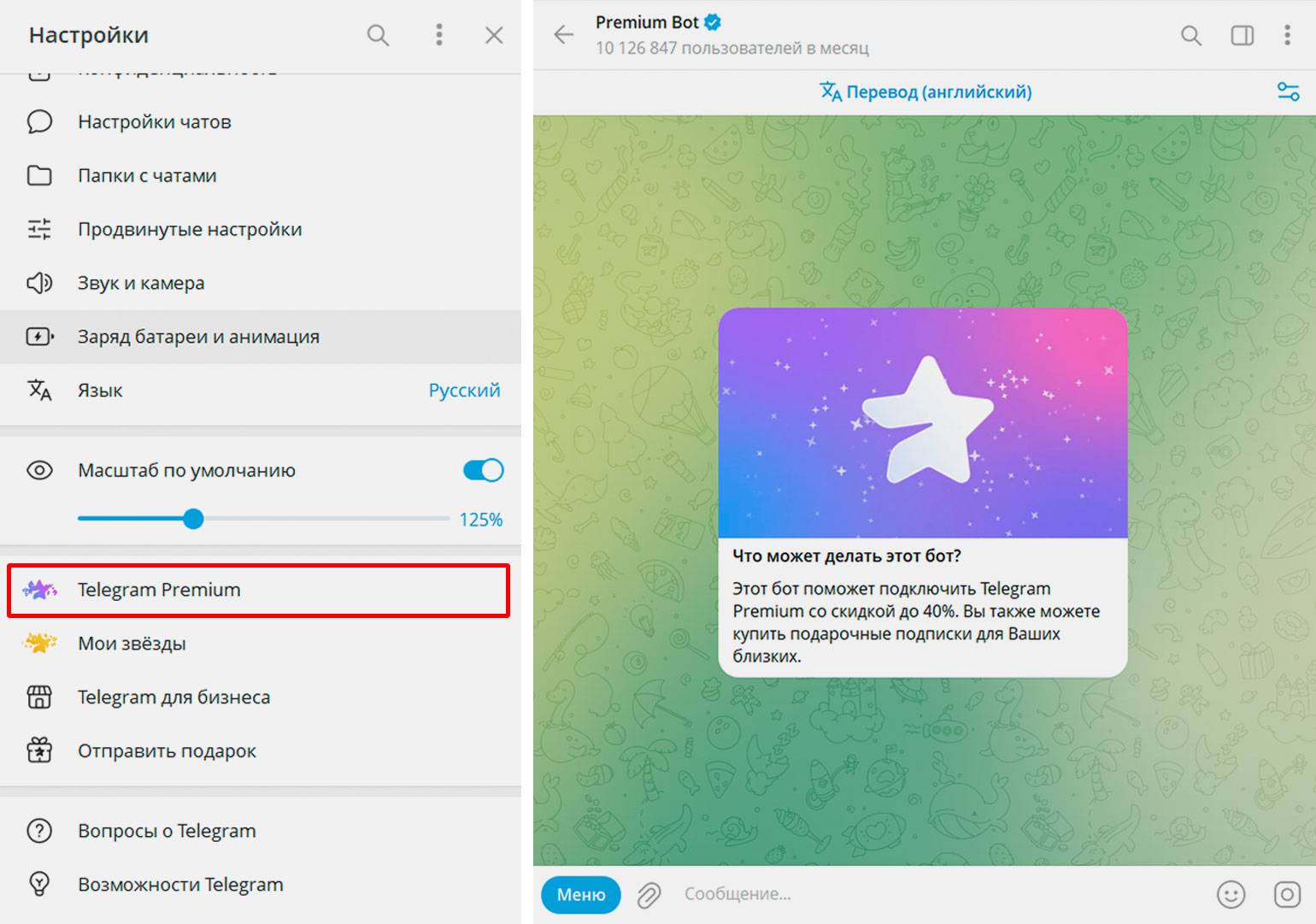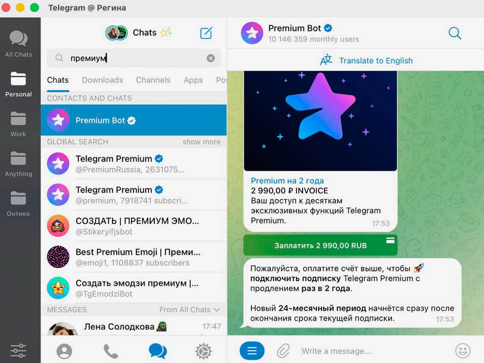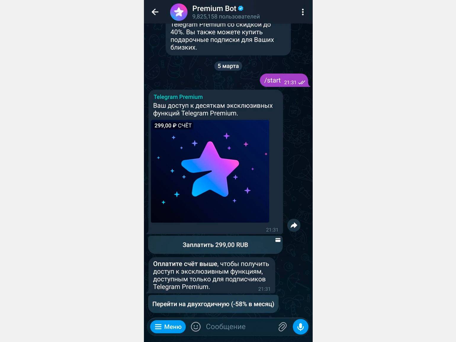 Следуя инструкциям бота, оплатите Telegram Premium — через SberPay или банковской картой. После оплаты вам станут доступны все функции подписки, а рядом с именем в профиле появится значок Premium.