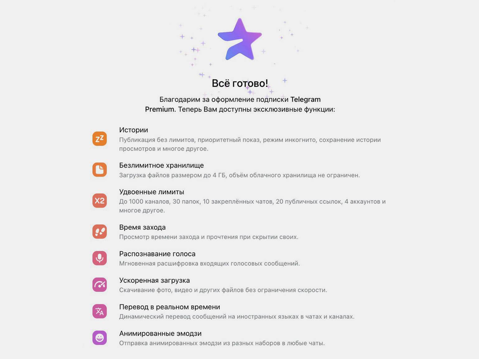 - Ускоренная загрузка файлов. Медиа и документы скачиваются быстрее, чем у пользователей без подписки.