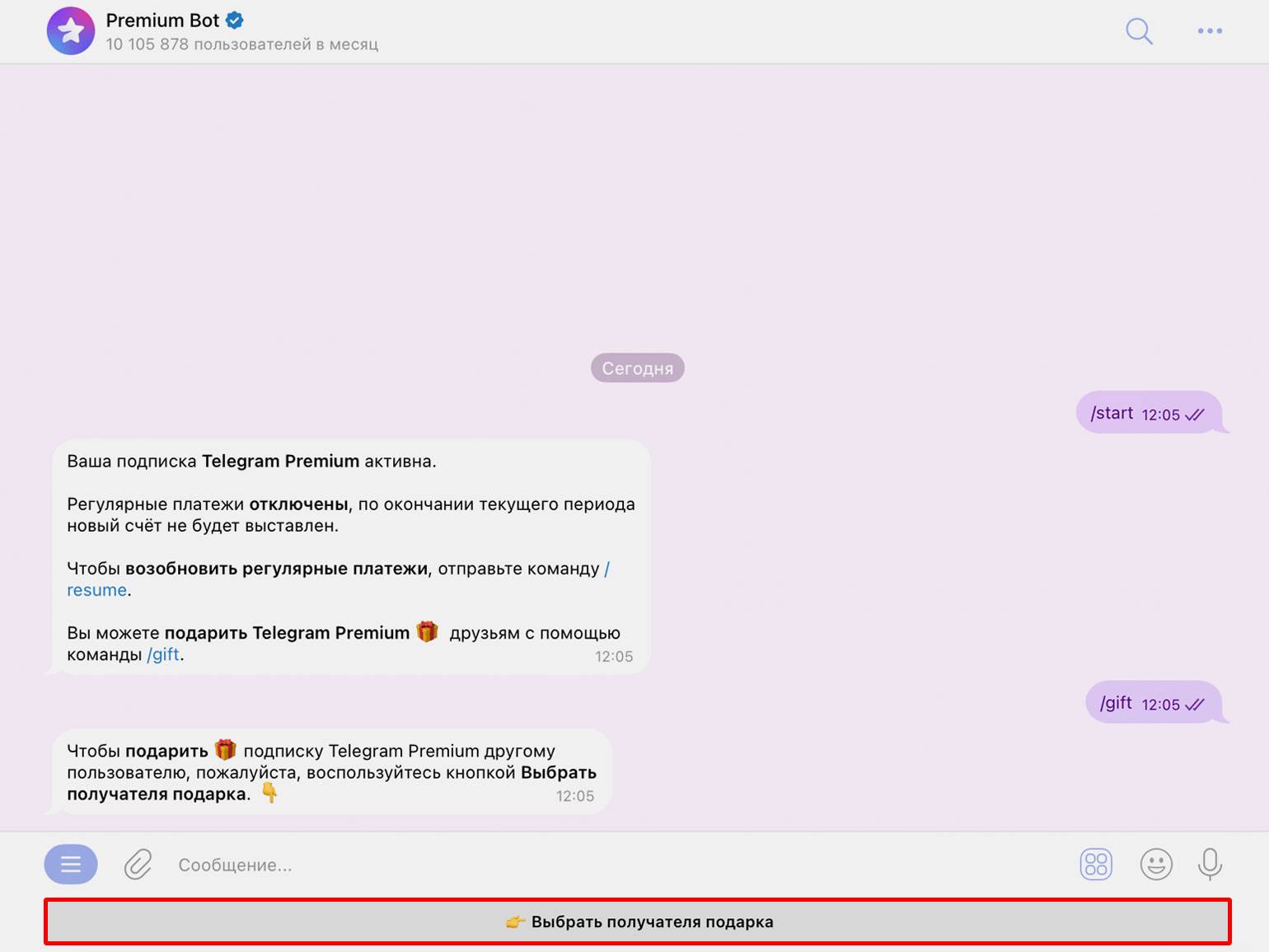 В меню бота нажмите на команду «Подарить Telegram Premium» и выберите получателя подарка.