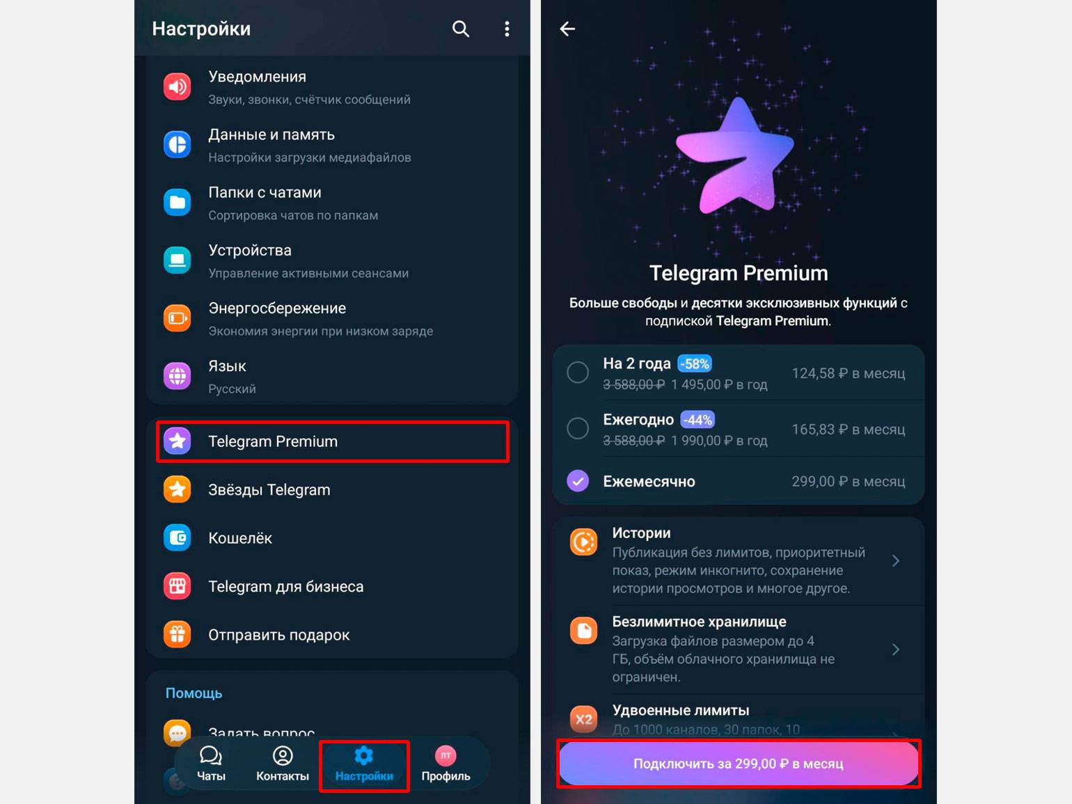 Зайдите в «Настройки» и выберите пункт Telegram Premium. В появившемся окне выберите срок действия подписки и нажмите кнопку «Подключить» — приложение перенаправит вас в Premium Bot.