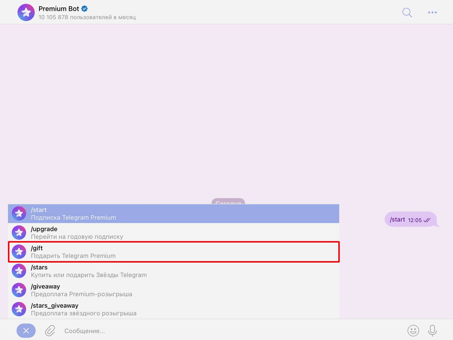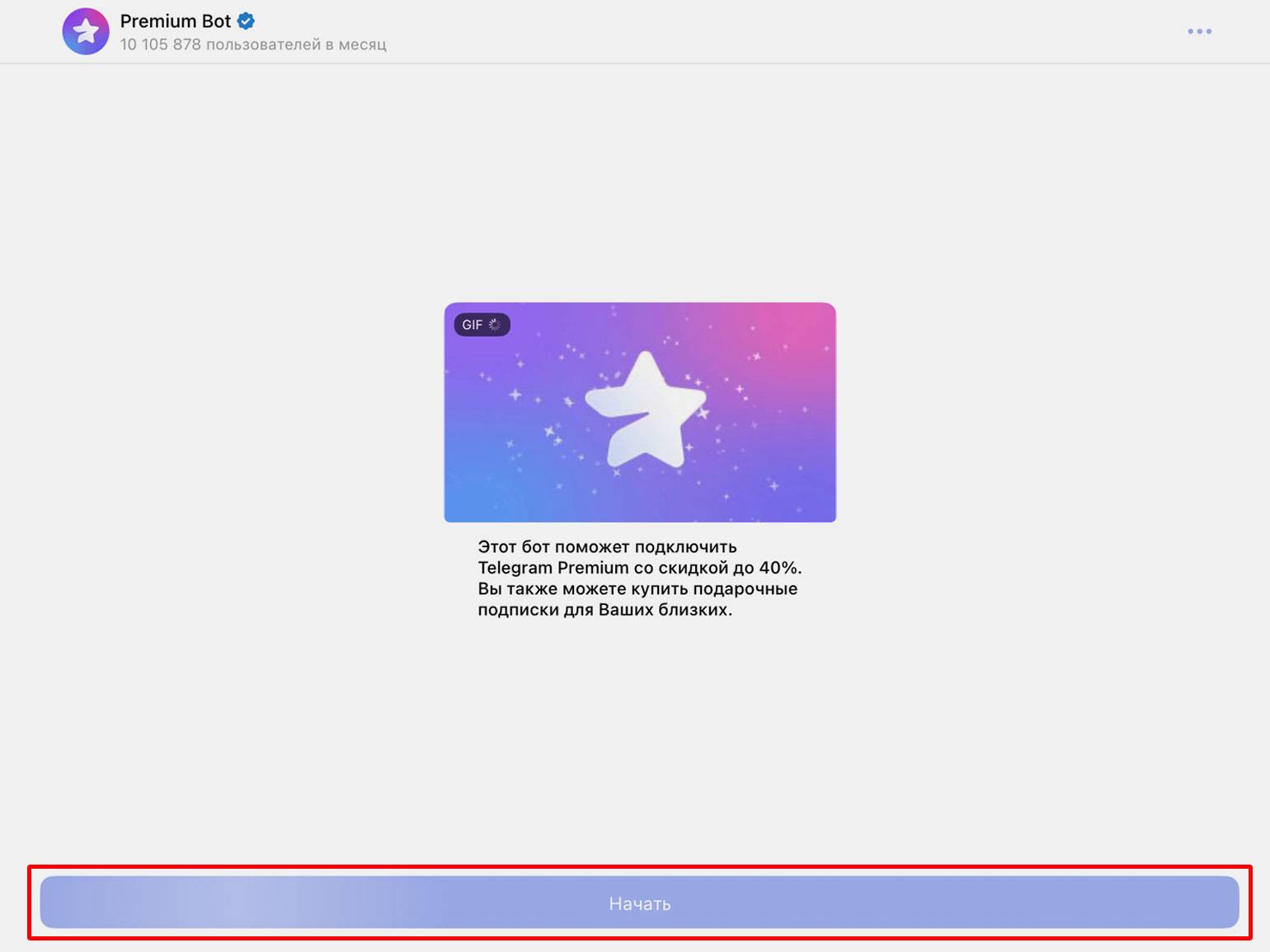 Подарить Telegram Premium другому пользователю можно так же через официального бота. Откройте Premium Bot — с компьютера или смартфона, — и нажмите кнопку «Начать».