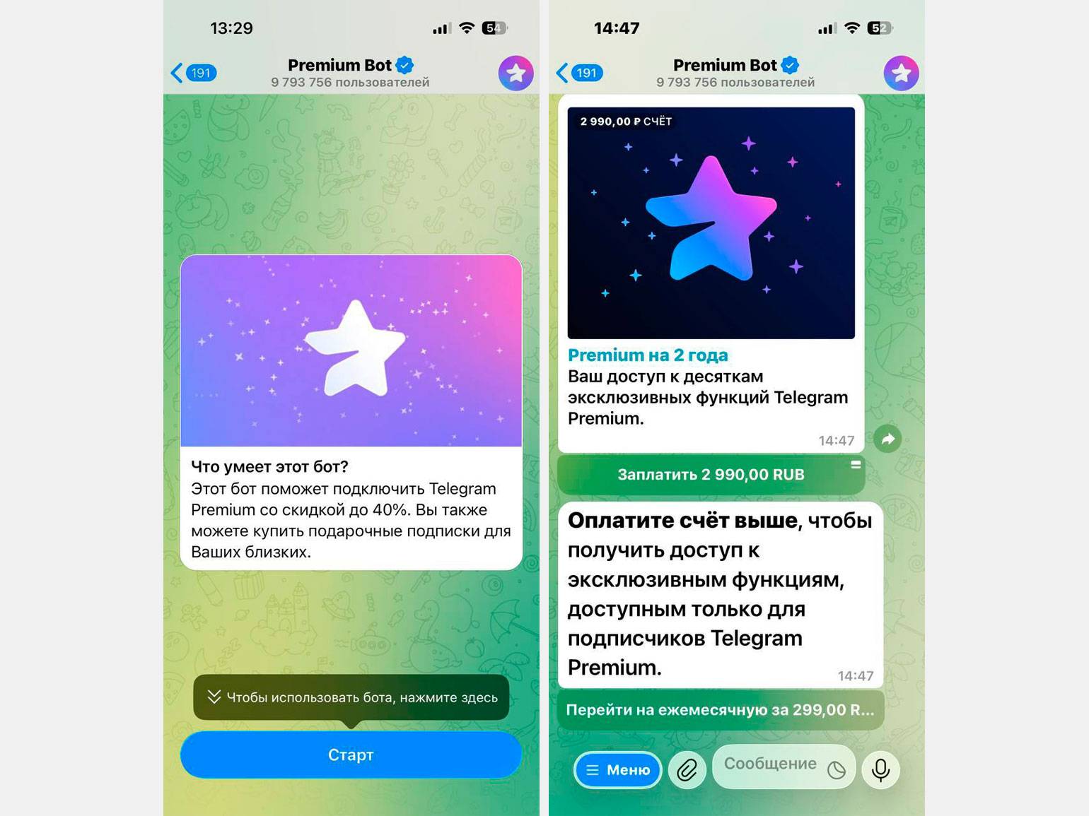 Также Telegram Premium можно оформить сразу через бота. Через поисковик Telegram найдите Premium Bot и нажмите кнопку /start. В меню бота выберите срок действия подписки и оплатите её.